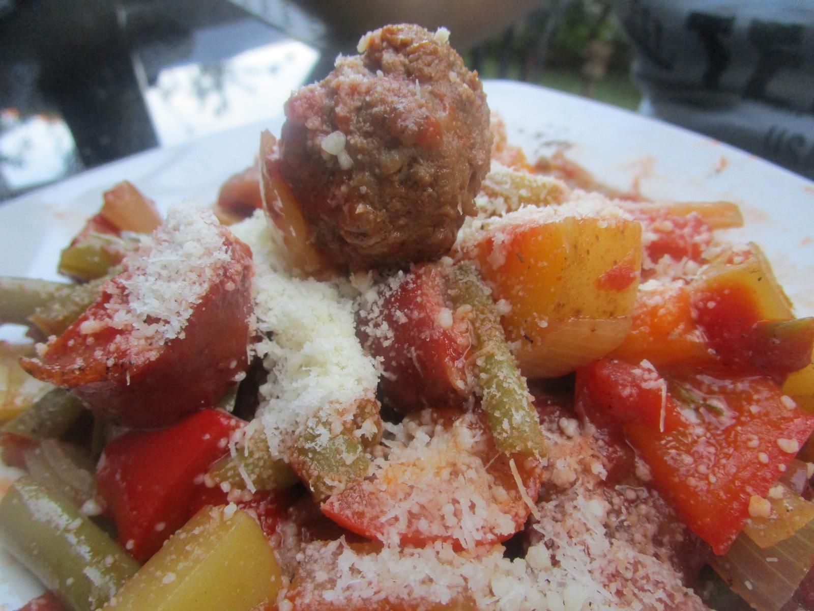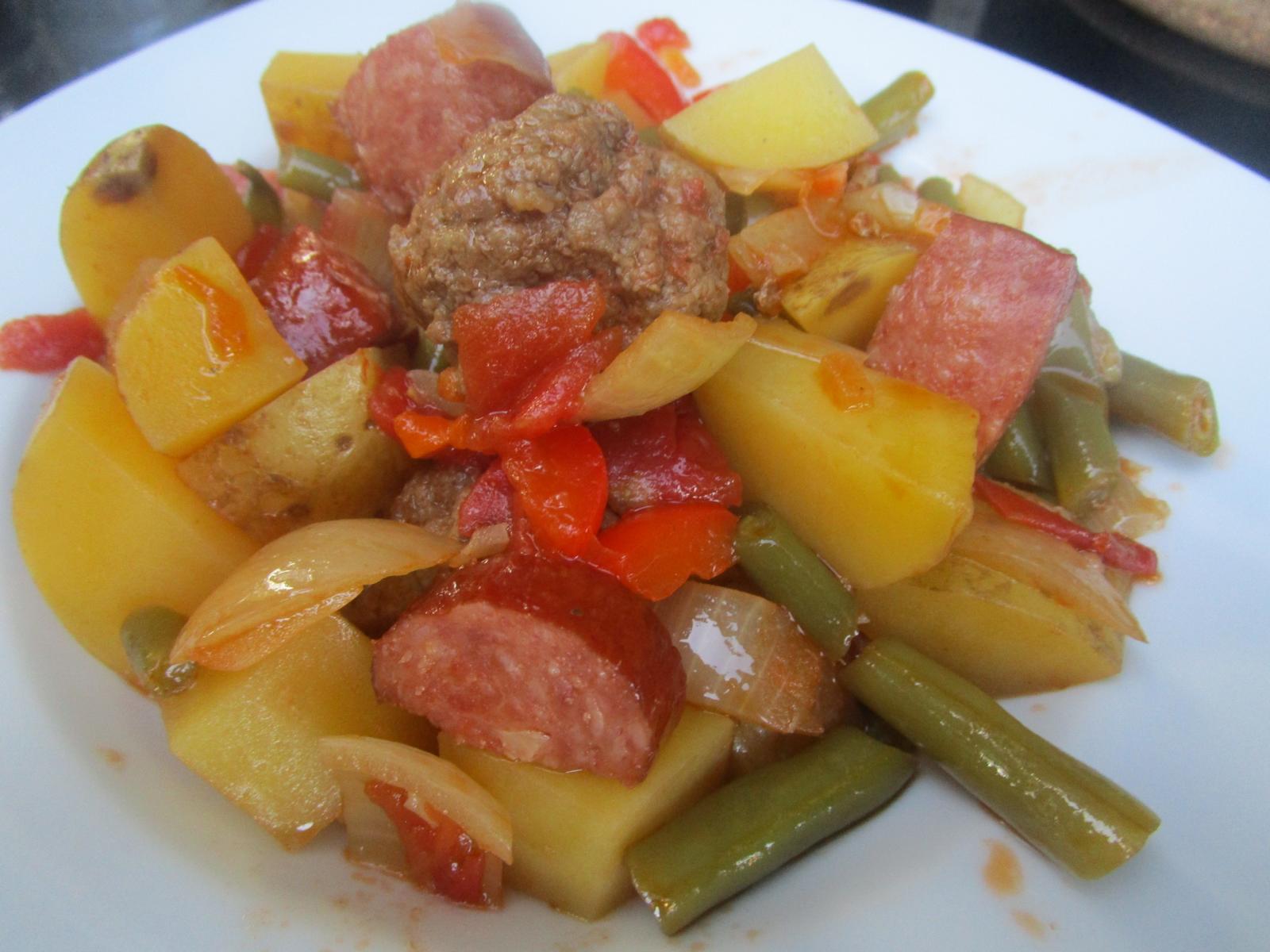 - Wenn die Bällchen dann schön Farbe bekommen haben, können sie wieder aus dem Dutch Oven genommen werden. Ich stelle sie wieder beiseite und gebe nun die Zwiebeln, die Paprika und die Cabanossistückchen hinein.