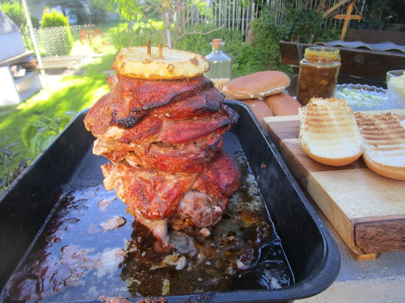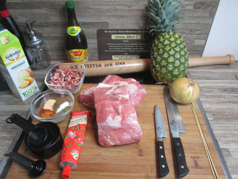- Darauf schichtet man jetzt Scheibe für Scheibe das marinierte Fleisch und fixiert den fertigen Spieß zuletzt noch mit der letzten Scheibe Ananas