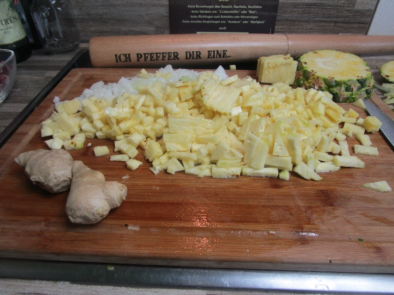 - In der Zwischenzeit die Zwiebel hacken und die Ananas schneiden. Zwei Schweiben der Ananas für den Spieß aufheben und den Rest in kleine Stückchen schneiden.