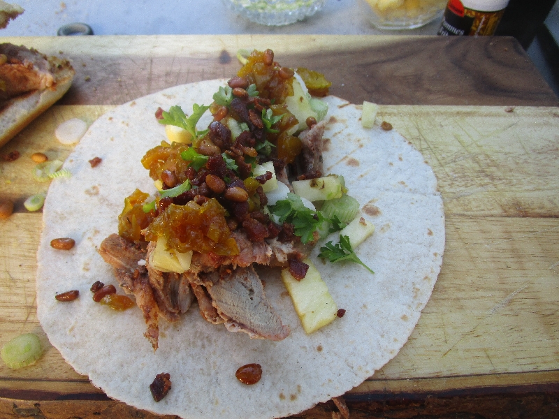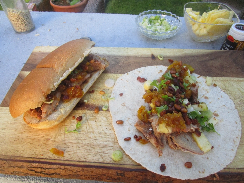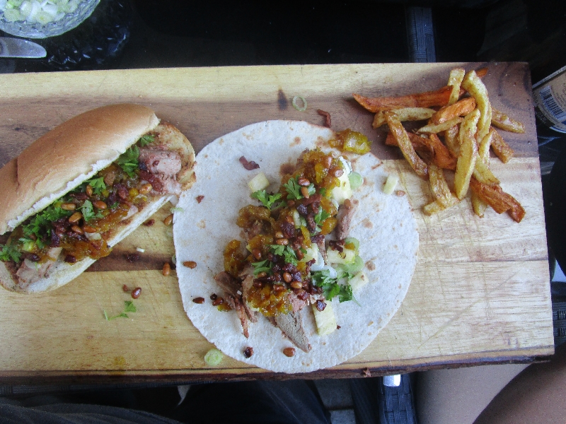 - Kurz bevor das Fleisch gar ist sollte man noch kurz die Tacos und Hotdog-Brötchen anrösten und dann kann man endlich zusammenbauen, was schon sehnlichst aufeinander wartet.