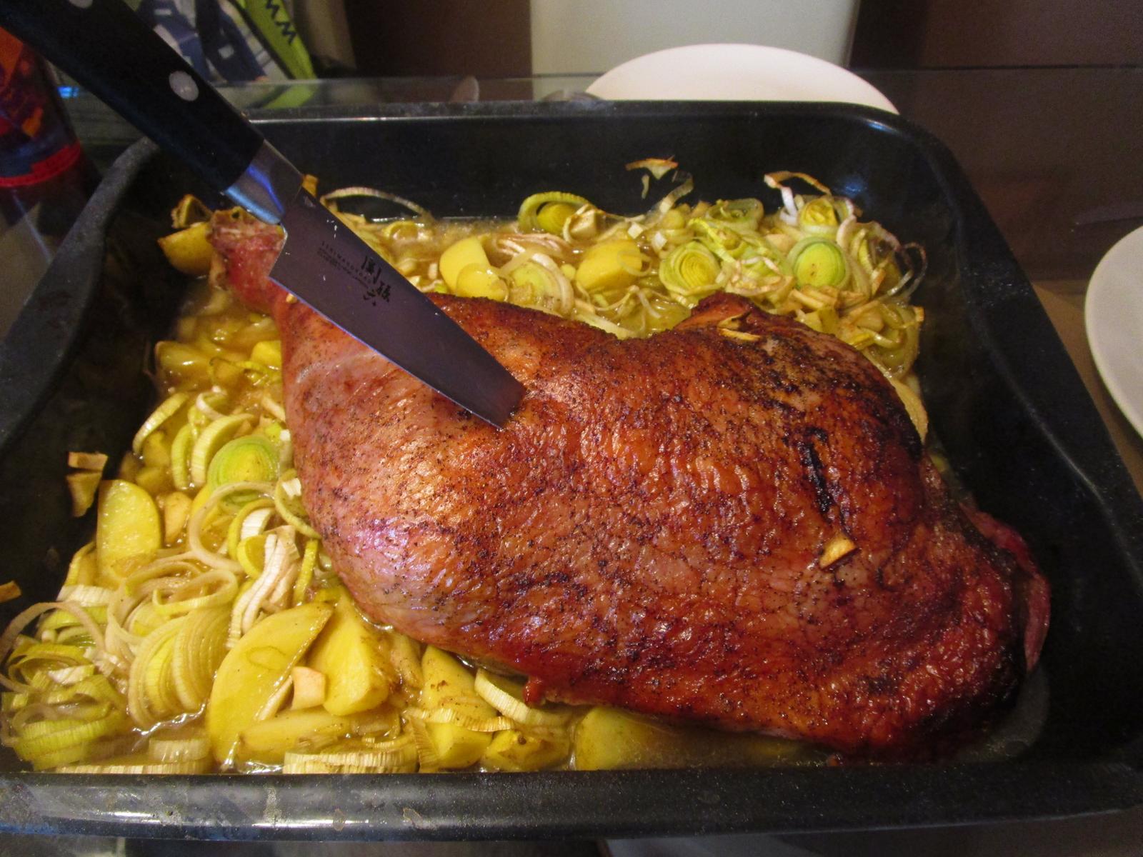 - Dort lassen wir sie erst mal für 45 Minuten in Ruhe. Nach diesen 45 Minuten gebe ich die Hühnerbrühe in den Bräter. Außerdem bereite ich mir während dieser dreiviertel Stunde das Gemüse vor. Das heißt, die Kartoffeln werden geschält und in Spalten geschnitten, die Äpfel werden geschält, entkernt und in Würfel geschnitten und der Lauch wird geputzt und in Ringe geschnitten. Die Äpfel gebe ich in den Apfelsaft, damit sie nicht Braun werden, bis wir sie brauchen.