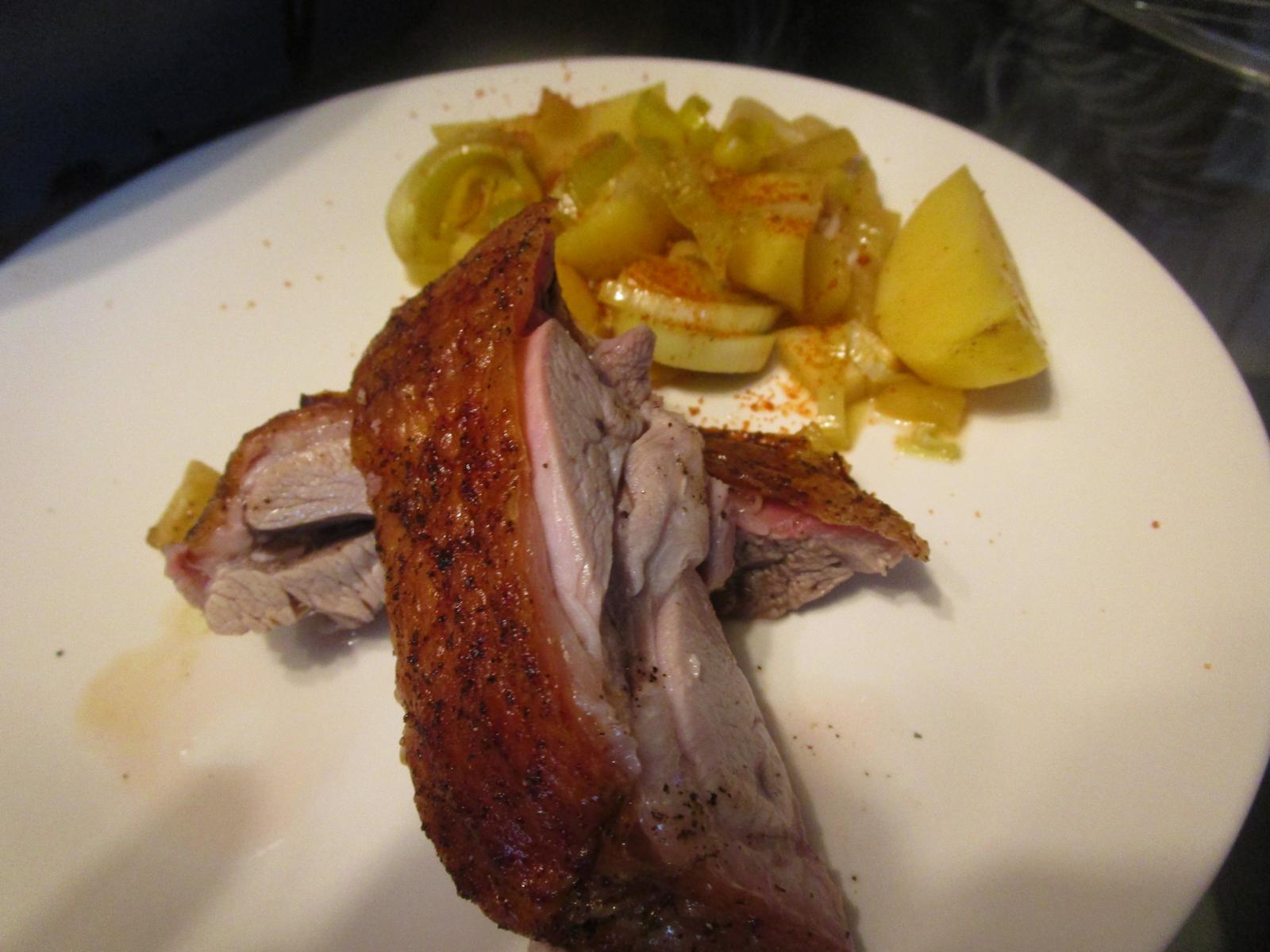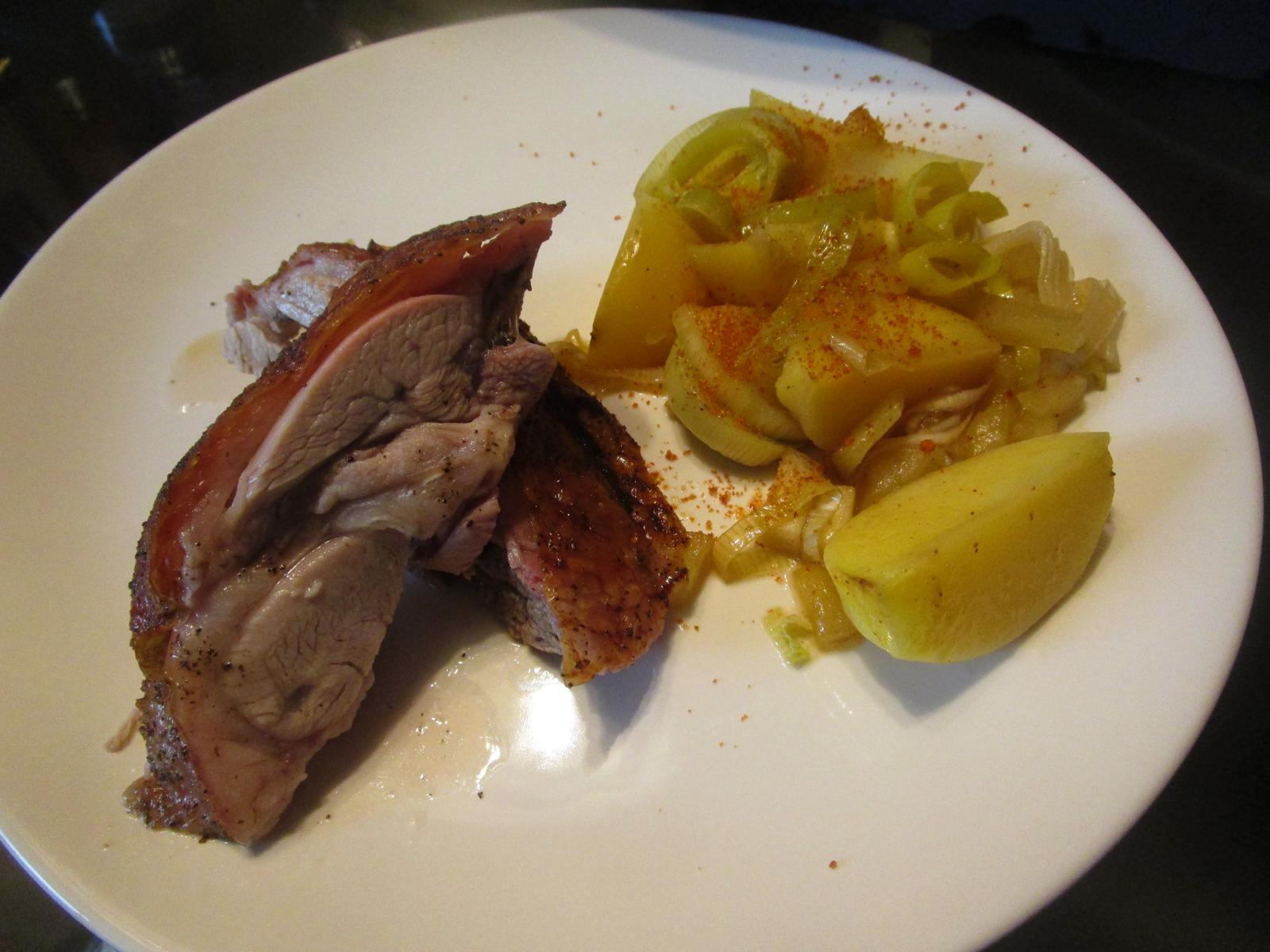 - So grille ich alles eine weiter Stunde, bis die Keule durch und die Kartoffeln weich sind.