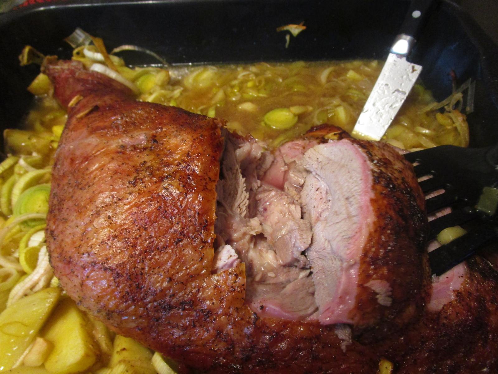 - Nach also insgesamt 2 Stunden oder einer Kerntemperatur von ungefähr 75°C ist dann alles fertig und es kann gegessen werden.