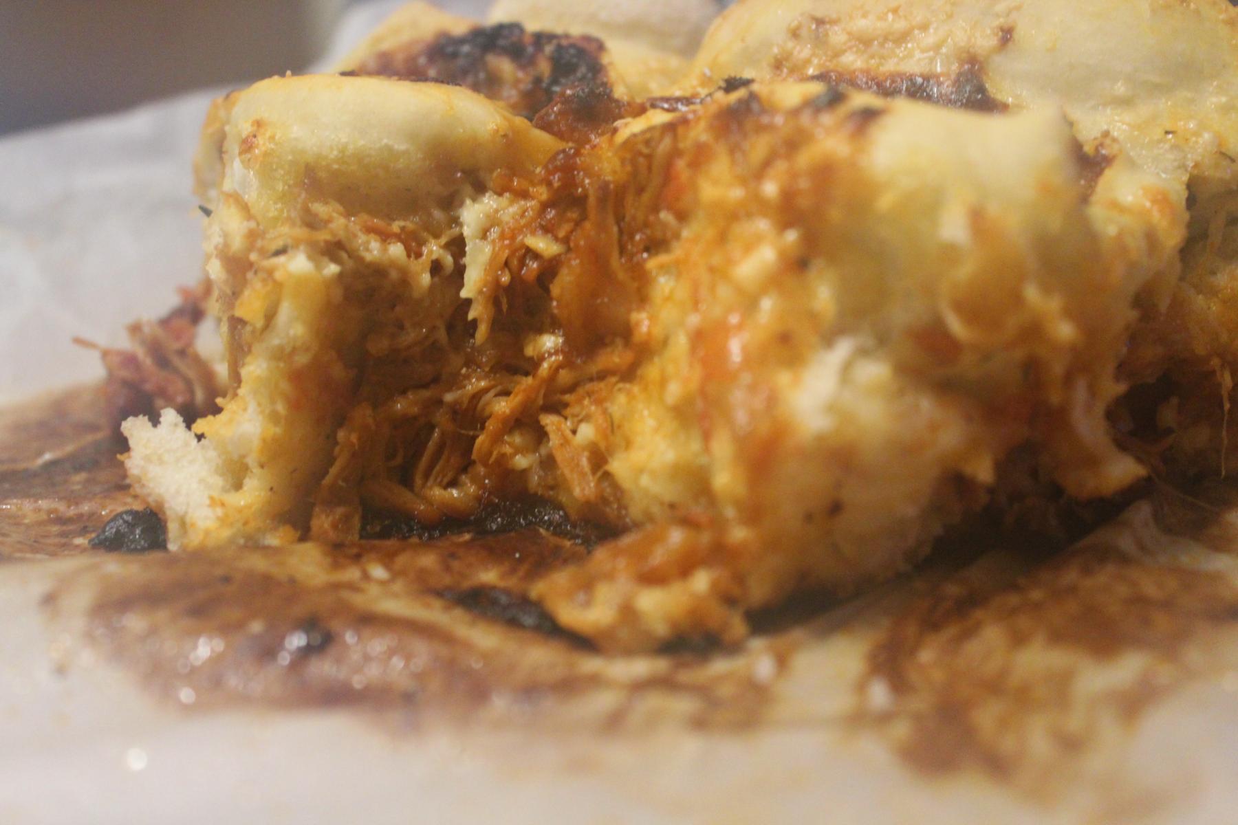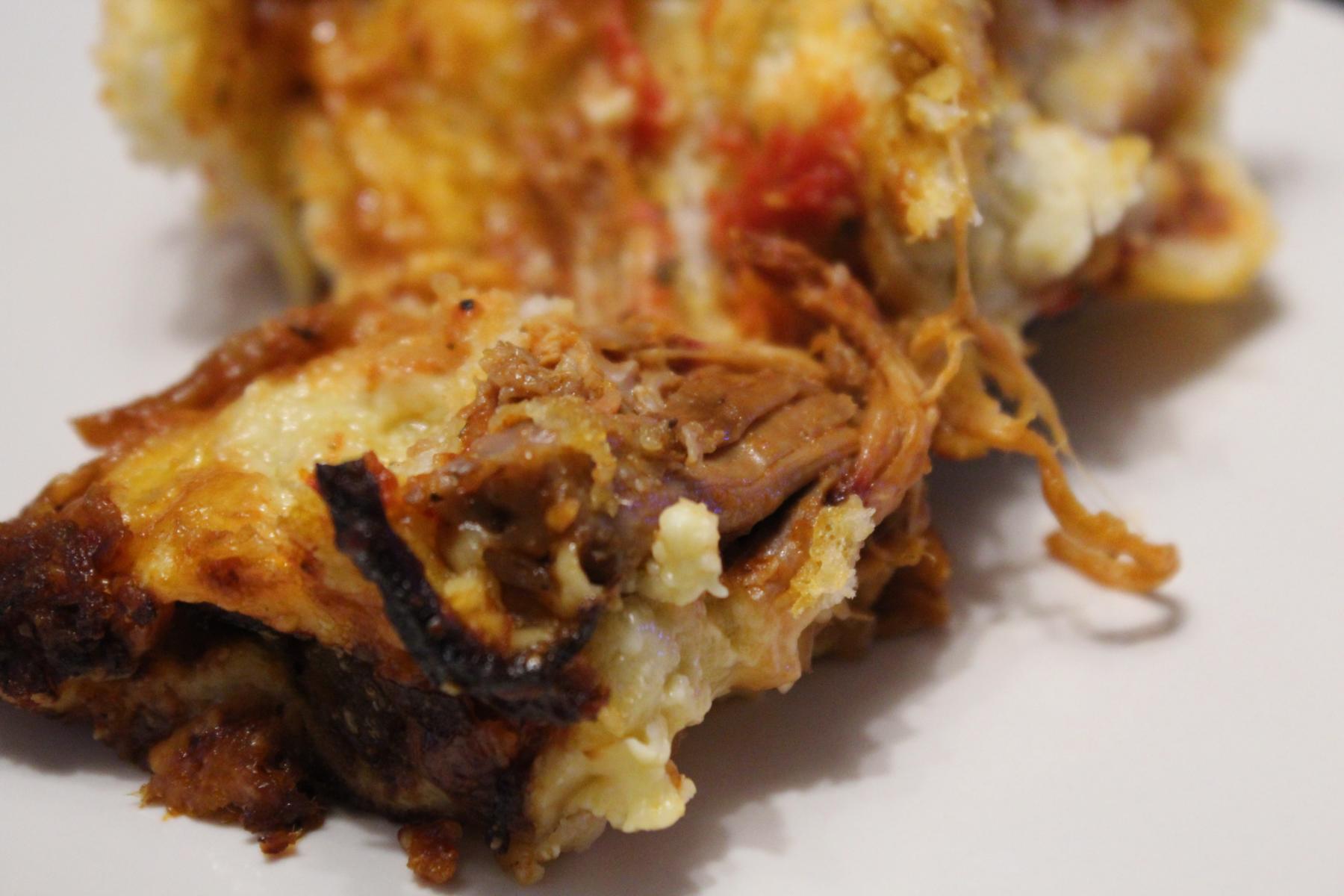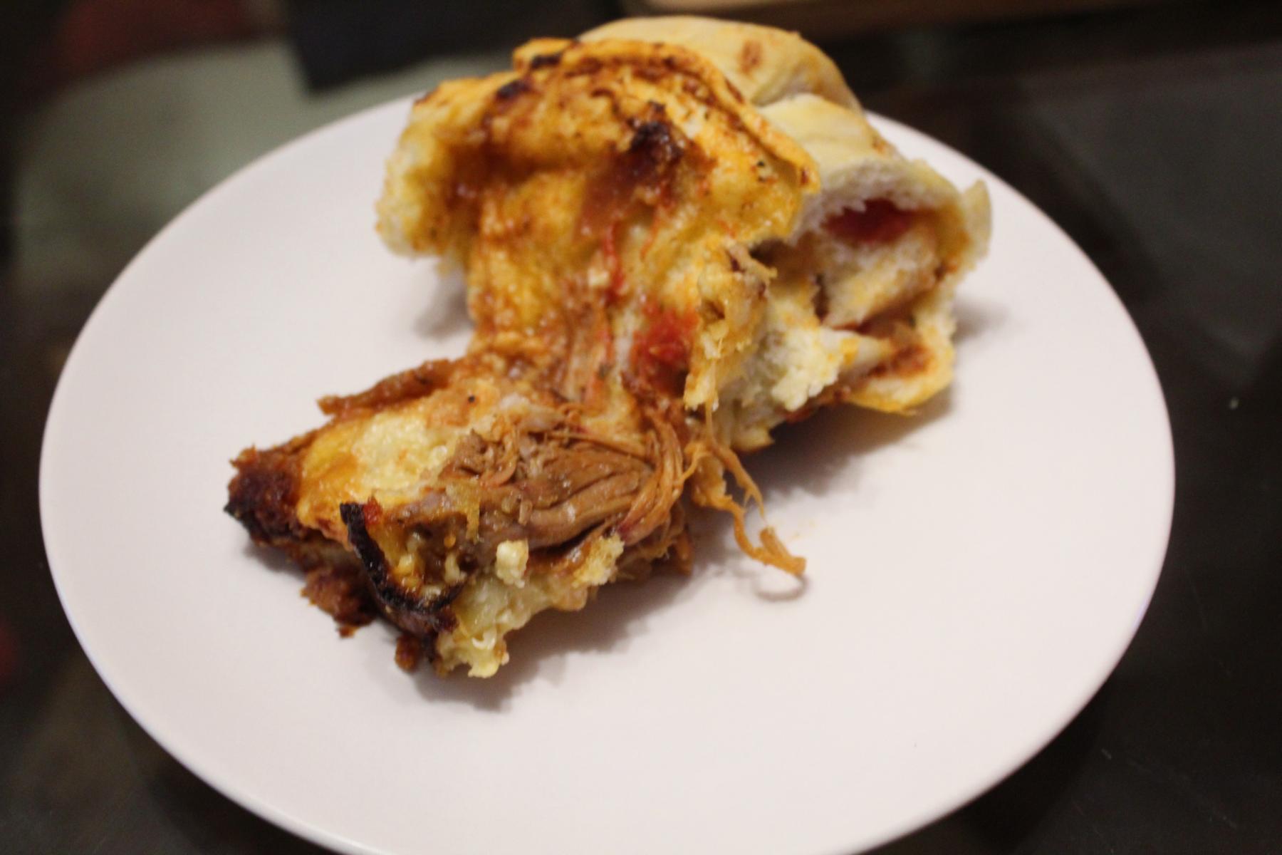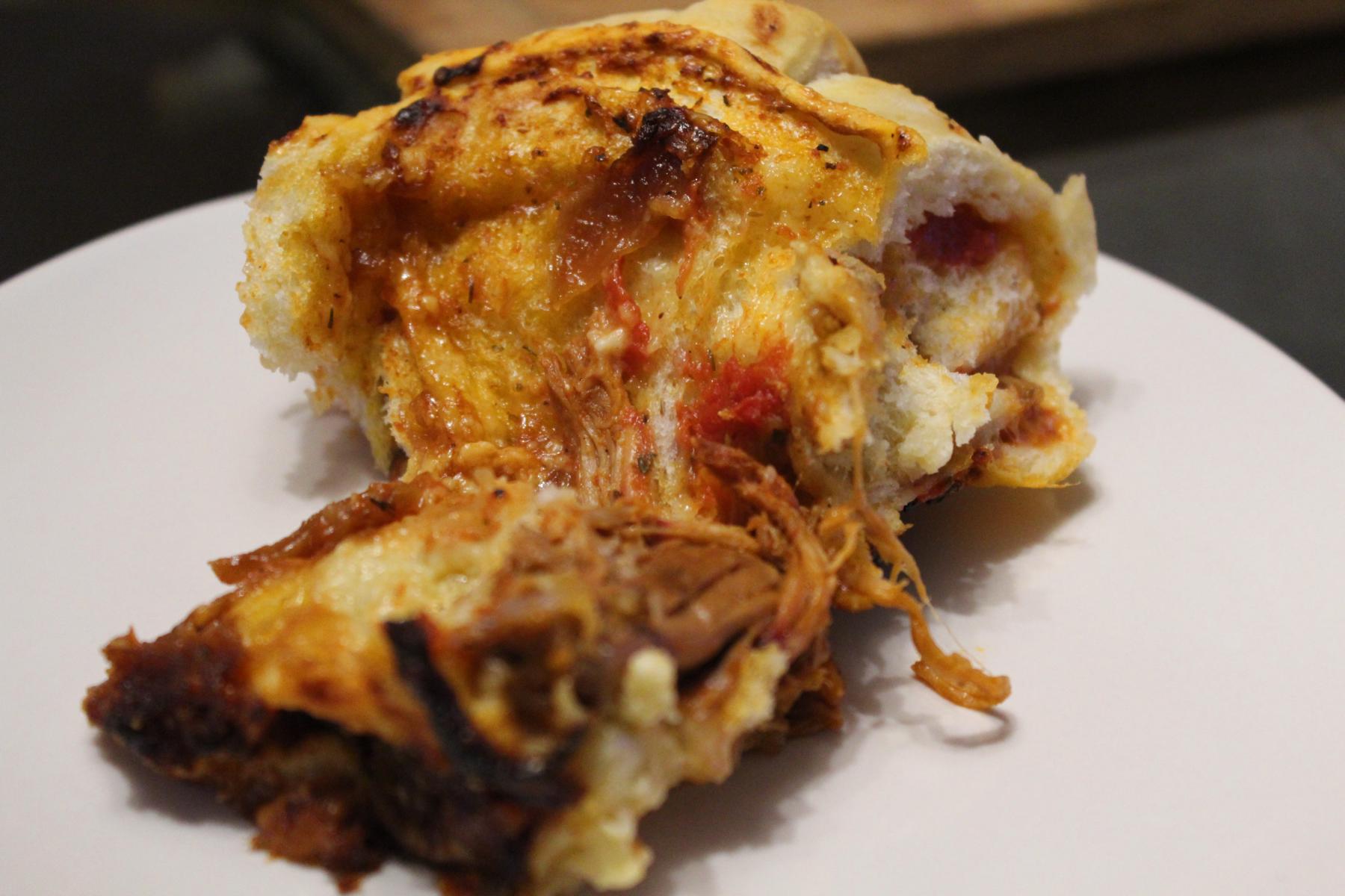 - Das erste Rechteck belege ich mit Tomatensauce, Pulled Pork, Röstzwiebeln und einem guten Klecks BBQ-Sauce.