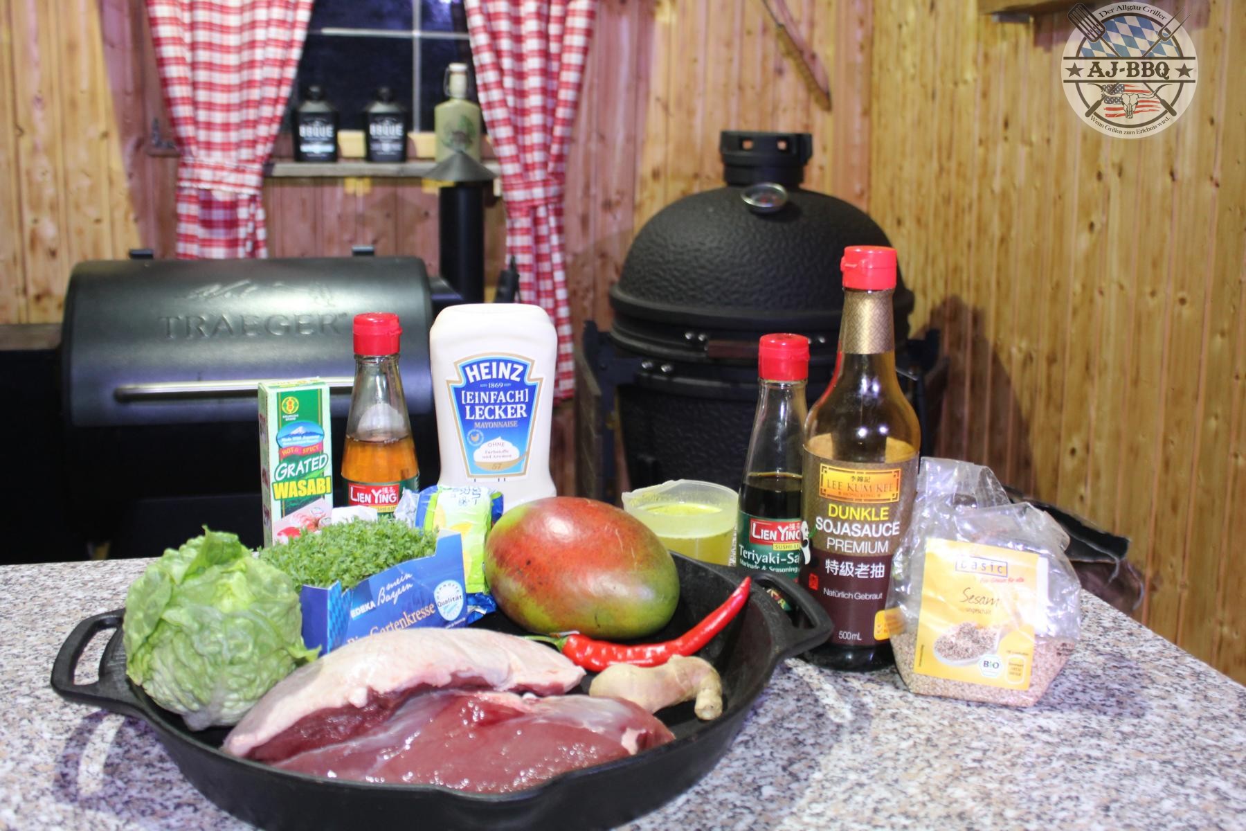 - In meinem heutigen Rezept geht es erst mal heiß los, ich starte den Grill. Verwenden werde ich den Bastard Keramikgrill, aber natürlich geht auch jeder andere Grill, in dem man eine indirekte Zone (eine Zone in der das Grillgut nicht direkt über der Kohle liegt) einrichten kann und der einen Deckel hat. Im ersten Schritt werde ich die Entenbrüste anbraten müssen, daher heize ich den Grill auf etwa 180 – 200°C hoch und später, für die Hauptgrillzeit, benötige ich 140°C. Was noch fehlt, ist eine Pfanne, die gebe ich gleich mit in den Grill, damit sie heiß werden kann.