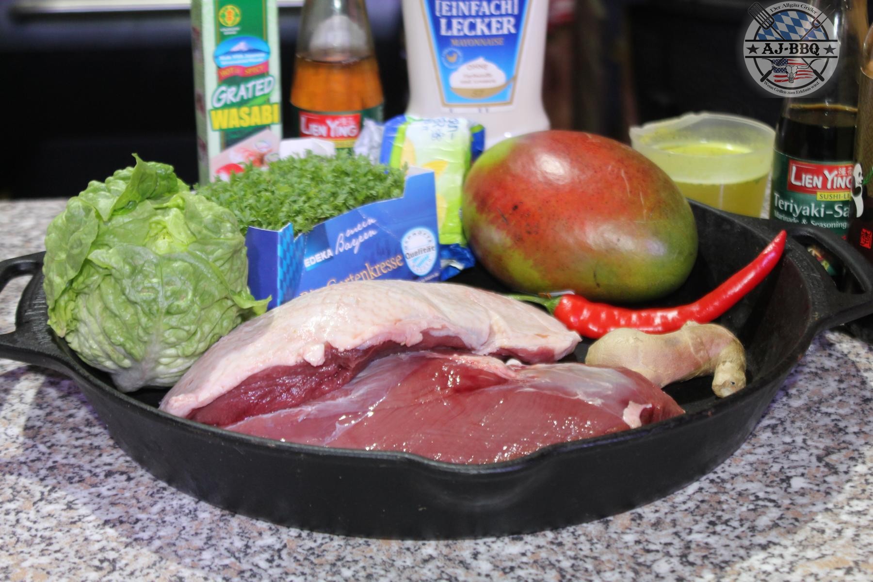 - Bis der Grill nun seine Temperatur erreicht hat, werde ich mich um das würzen der Entenbrüste kümmern. Dafür gebe ich sie in eine Schüssel und vermische sie dort mit 4 TL Fünf-Gewürze-Pulver, 2 TL Rohrzucker und einer schönen Prise Salz. Die Gewürze massiere ich schön in das Fleisch der Entenbrust ein, auch auf der Hautseite dürfen diese reichlich gewürzt werden. Außerdem schäle und reibe ich schnell noch den Ingwer, hacke die Chilis fein und entkerne, schäle und schneide die Mango in Würfel. Somit sind auch schon alle Vorbereitungen abgeschlossen.