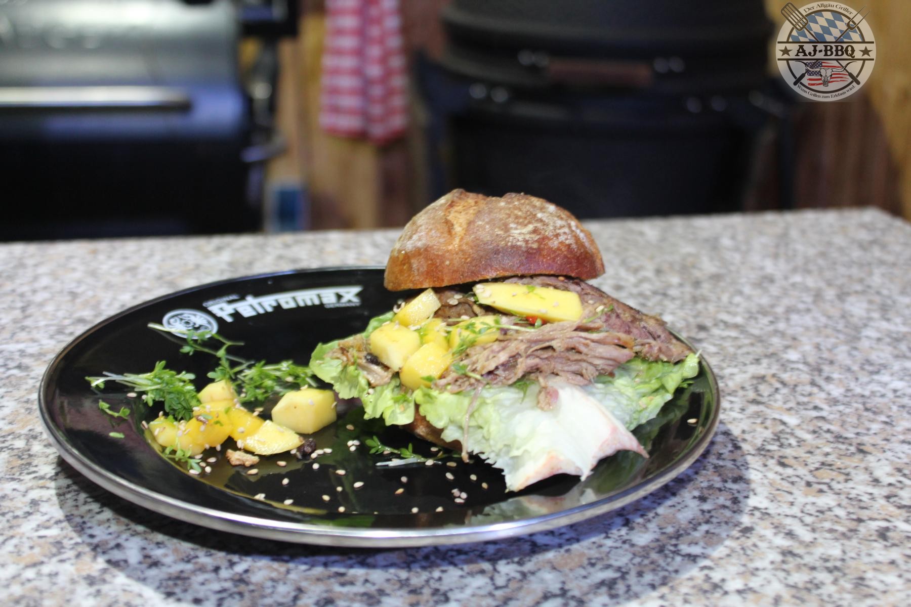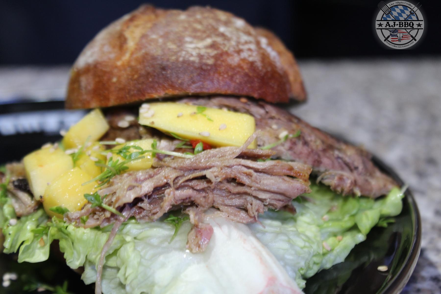 - Nach der Dünstphase ist die Haut der Entenbrüste natürlich alles andere als knusprig, daher schneide ich diese einfach weg. Wer möchte, kann die Haut noch in Streifen schneiden und knusprig frittieren. Das ist mega lecker. Die Entenbrüste gebe ich in eine Schüssel und zerrupfe mir diese, bis sie in lauter kleine Fasern zerfleddert ist. Jetzt muss ich nur noch schnell den Burger zusammensetzten und schon können wir essen. Dafür schneide ich die Roggenbrötchen auf, bestreiche die Unterseite dick mit der Wasabimayo, gebe darauf etwas Salat fürs Auge, verteile dann die Pulled Ente darüber und bestreue dann noch alles mit Sesam, Kresse und den Mangostückchen. Jetzt noch schnell den Deckel drauf und los geht’s! Dieser „Burger“ ist sowas von lecker! Macht ihn mal nach, ihr werdet es nicht bereuen.