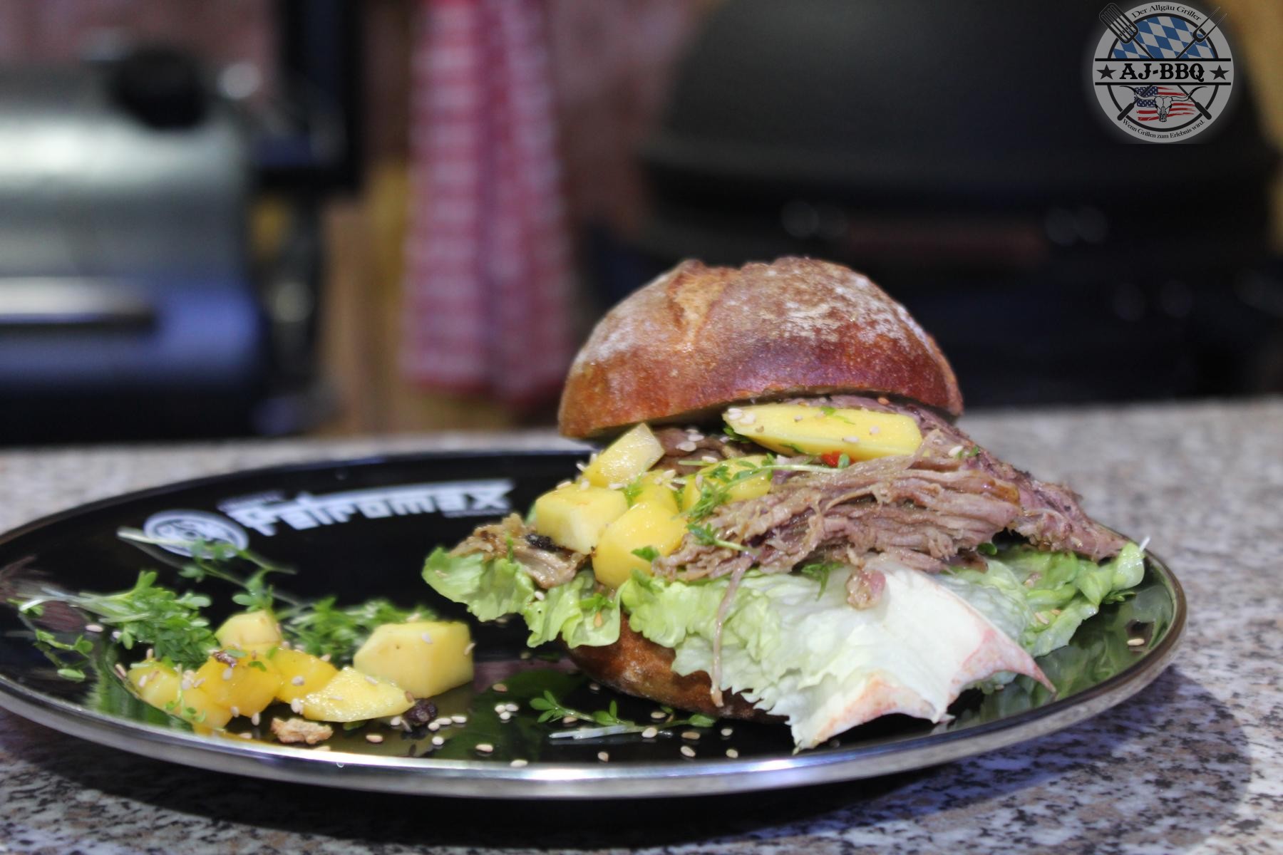 Nach der Dünstphase ist die Haut der Entenbrüste natürlich alles andere als knusprig, daher schneide ich diese einfach weg. Wer möchte, kann die Haut noch in Streifen schneiden und knusprig frittieren. Das ist mega lecker. Die Entenbrüste gebe ich in eine Schüssel und zerrupfe mir diese, bis sie in lauter kleine Fasern zerfleddert ist. Jetzt muss ich nur noch schnell den Burger zusammensetzten und schon können wir essen. Dafür schneide ich die Roggenbrötchen auf, bestreiche die Unterseite dick mit der Wasabimayo, gebe darauf etwas Salat fürs Auge, verteile dann die Pulled Ente darüber und bestreue dann noch alles mit Sesam, Kresse und den Mangostückchen. Jetzt noch schnell den Deckel drauf und los geht’s! Dieser „Burger“ ist sowas von lecker! Macht ihn mal nach, ihr werdet es nicht bereuen.