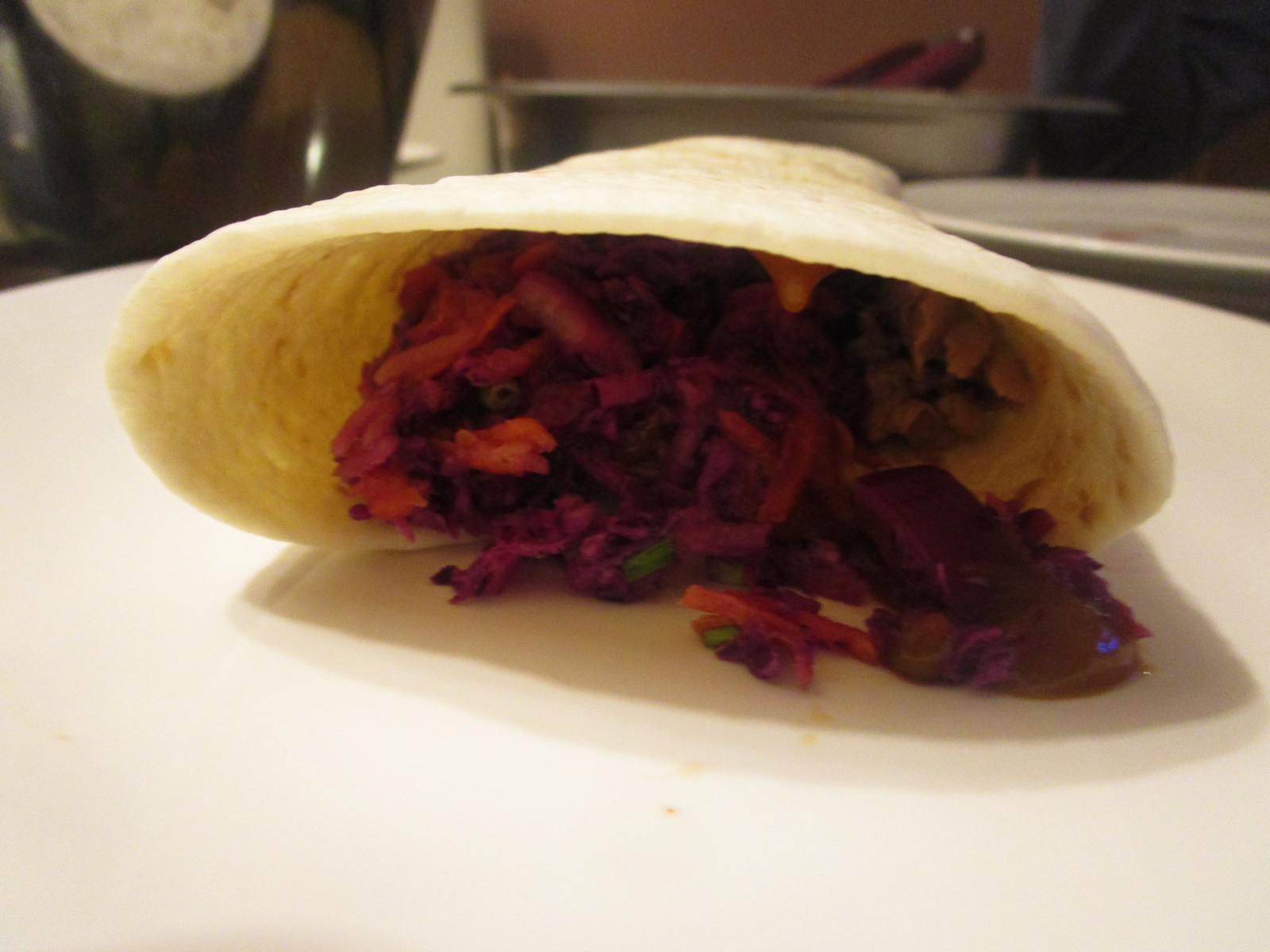- Jetzt muss nur noch der Wrap gebaut werden. Dafür gebe ich etwas Krautsalat, Pulled Pork und ein guter Spritzer BBQ Sauce nach Wahl auf den ausgebreiteten Tortilla Wrap, klappe die Seiten des Wraps ein und rolle ihn auf. Schon sind sie fertig, die Dutch Oven Pulled Pork Tortilla Wraps.