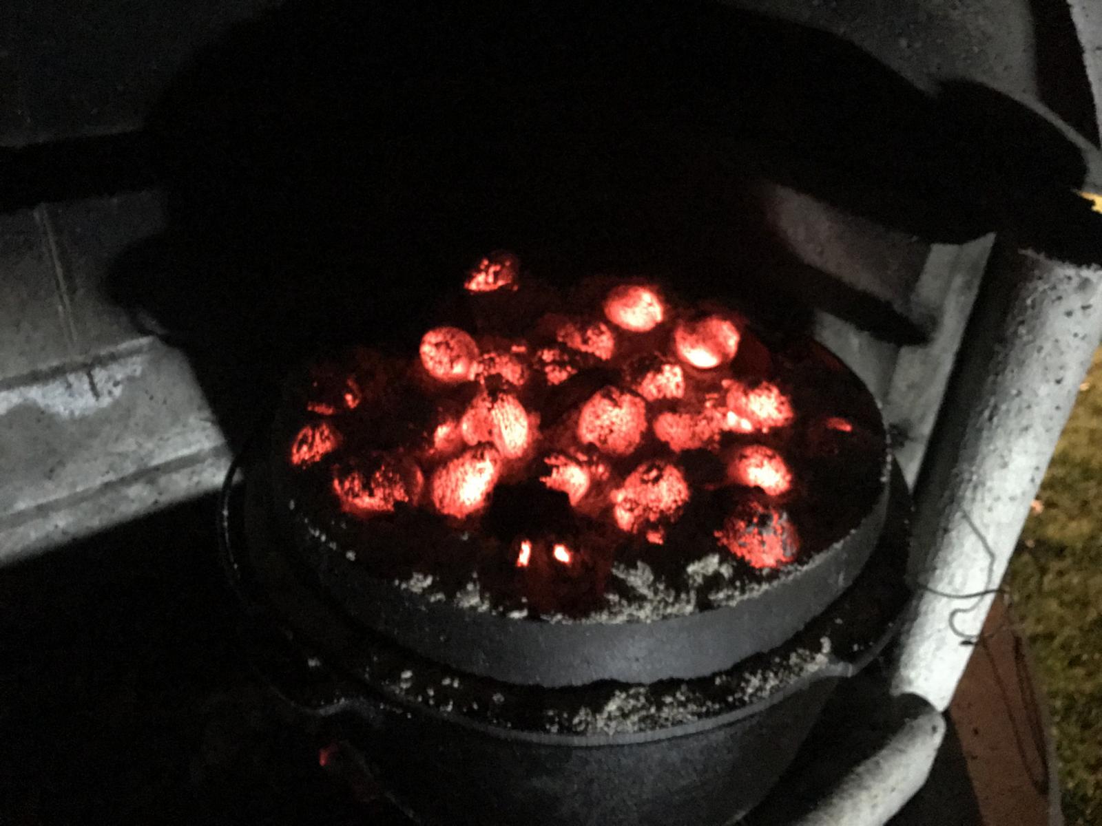 - Nachdem ich erneut Kohlen vorgeheizt habe, schließe ich den Dutch Oven und bestücke ihn mit eben diesen. Für meinen 12er Dopf benötige ich insgesamt 22 Stück. Davon kommen sieben unter den Dutch Oven und 15 auf den Deckel. Je nach Qualität der Kohlen muss man im Garverlauf eventuell nochmal welche nachlegen.