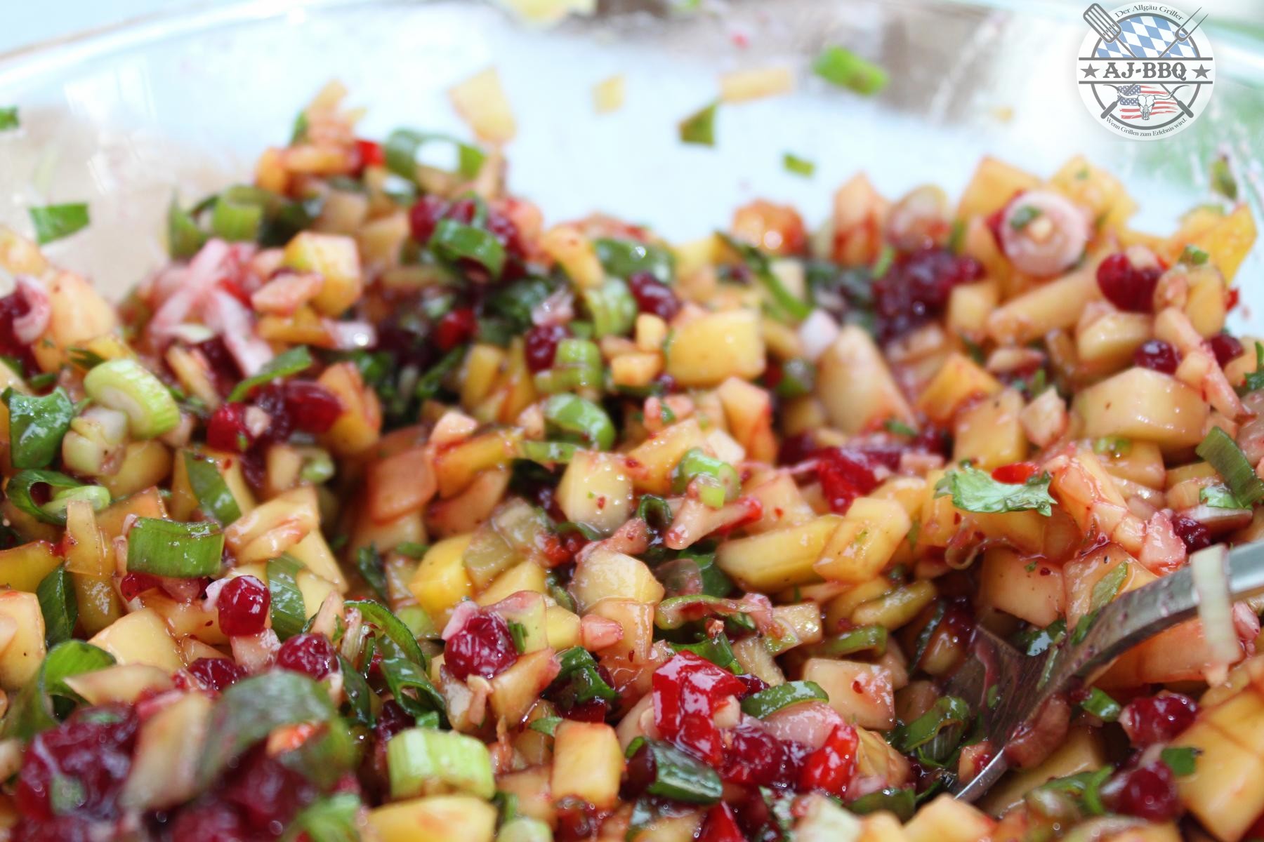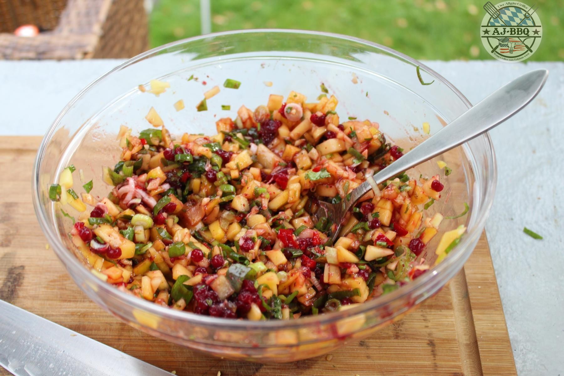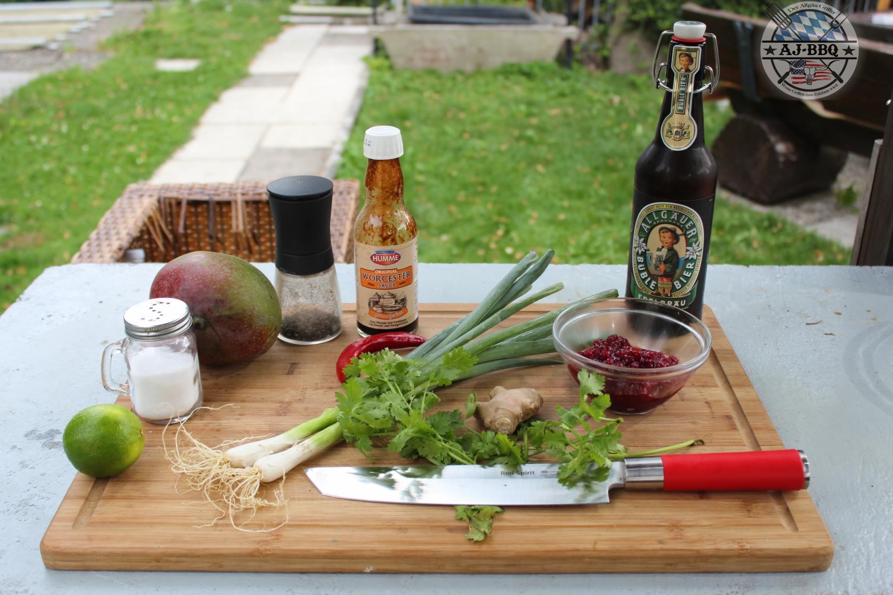 - Damit das Chutney durchziehen und somit seine Aromen entfalten kann, werde ich heute mit ihm beginnen. Dafür hacke ich die Mango, das Koriandergrün, 2 Frühlingszwiebeln, die Chili und den Ingwer klein und gebe alles in eine Schüssel. Jetzt reibe ich etwas Limettenschale darauf und gebe den Saft einer halben Limette mit dazu. Zum Schluss kommen noch die Preiselbeeren, einige Spritzer Worcestershiresauce, Salz und Pfeffer in die Schüsel, dann wird alles vermischt und das Chutney ist fertig.