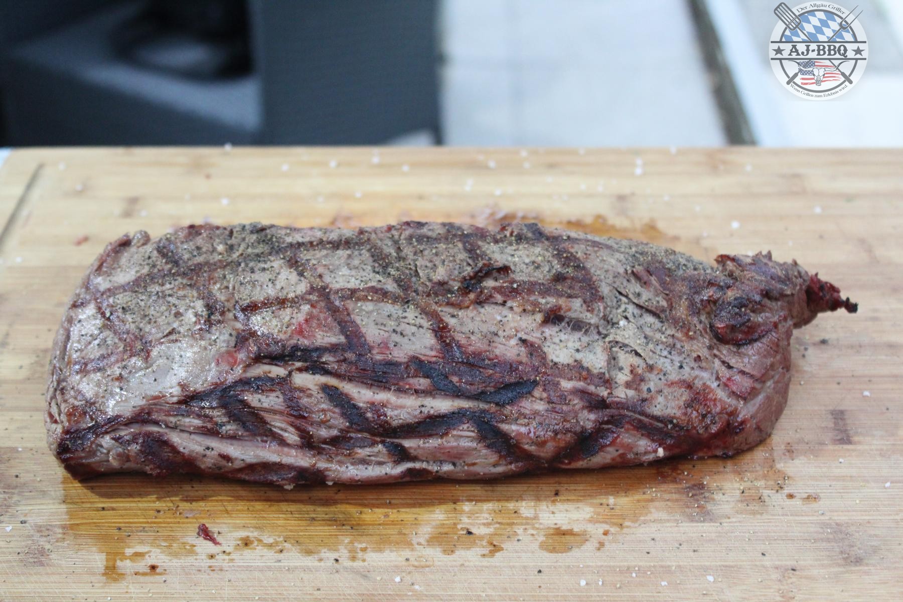 - Ist der Gußrost nun heiß, grille ich das Filet rundherum scharf an. Der Gußrost sorgt dabei für ein schönes Grillmuster. Ist das geschehen, nehme ich das Fleisch wieder vom Grill und regle den Grill auf eine Garraumtemperatur von etwa 160°C ein. Das mache ich natürlich durch schließen der Lüftungsschlitze des Grills. In der Zeit, die der Grill benötigt um auf die gewünschte Temperatur zu kommen, werde ich das Filet noch pfeffern. Das mache ich nicht vorher, da der Pfeffer bei den hohen Temperaturen während des angrillens verbrennt und bitter werden würde.
