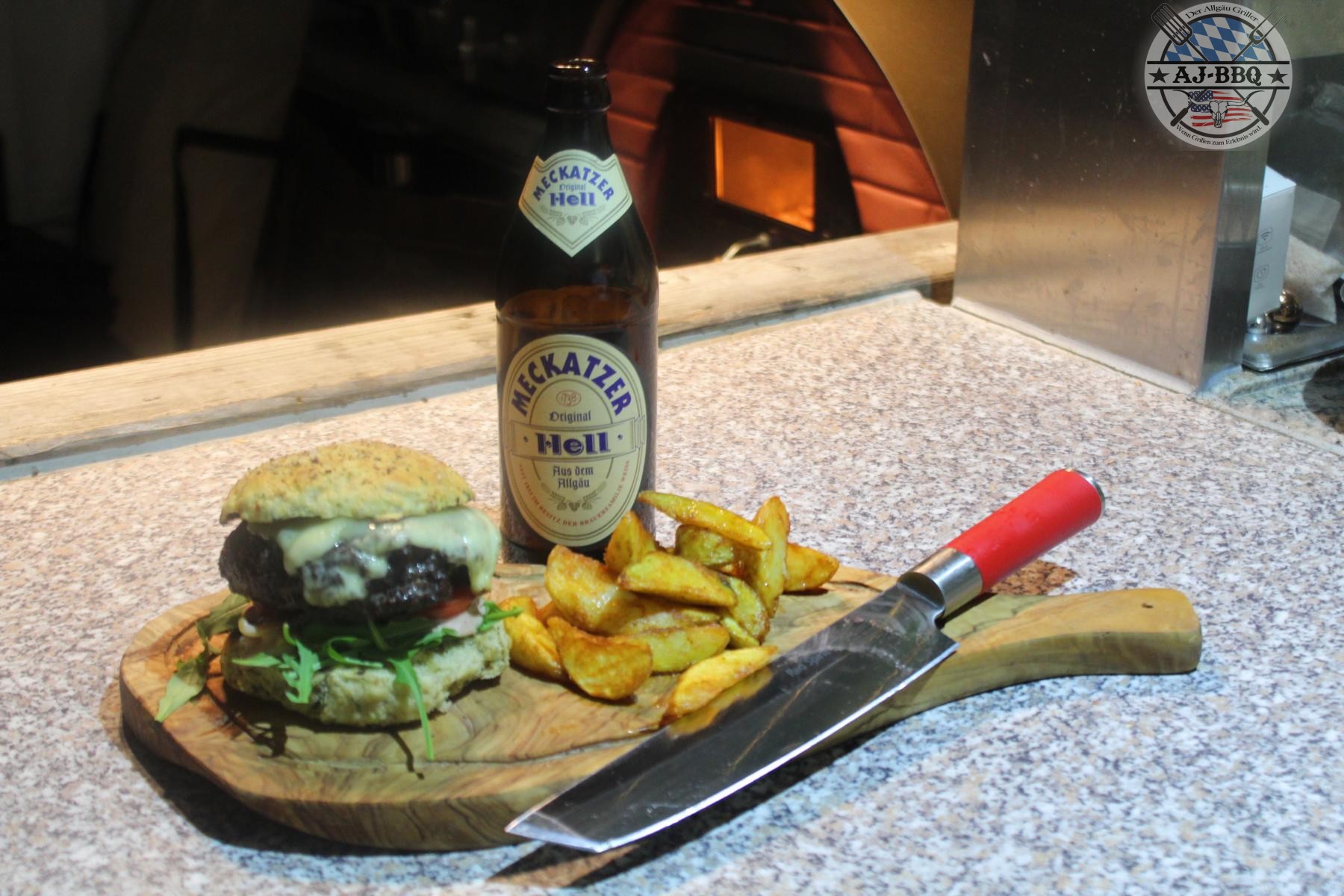 Ich belege nun die Brötchen Unterseite mit etwas Rucola und gebe etwas von der Sauce darüber. Dann schneide ich mir zwei dünne Scheiben von einer Tomate runter, lege diese auf die Sauce und platziere das Hackfleischpatty darüber. Jetzt noch schnell den Brötchendeckel drauf legen und fertig ist er, unser Rotweinburger. Ich habe übrigens meine Burgerbrötchen auch selbst gemacht und zwar nach einem Rezept von BBQ aus Franken. Hier der Link zu den Semmelknödelburgerbuns vom Sven.
