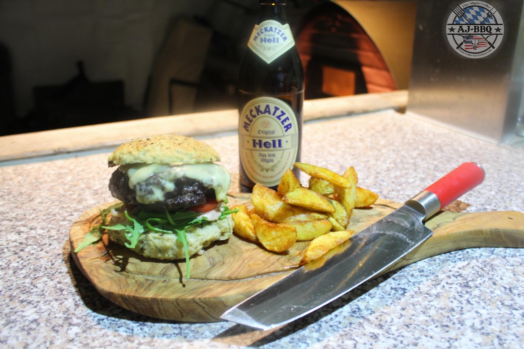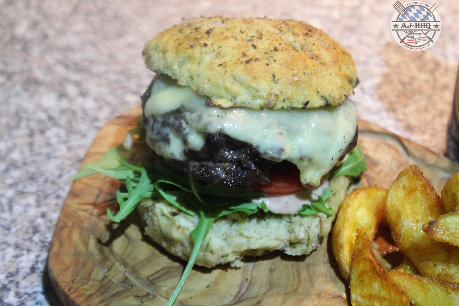 von ca. 56°C ziehen. Einige Minuten vor Ende der Garzeit gebe ich noch den Käse über das Hackfleisch und überbacke die Pattys somit. Außerdem grille ich die auseinander geschnittenen Burgerbrötchen auf der Innenseite etwas an.