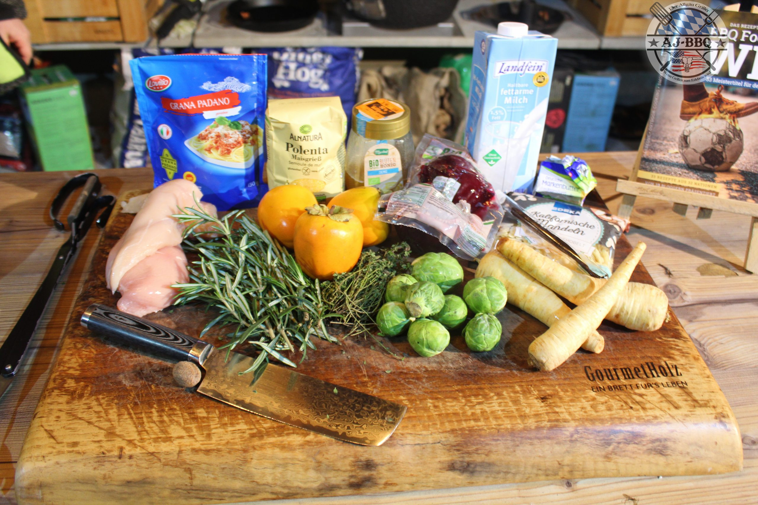- Im nächsten Schritt entferne ich das Kerngehäuse der Kakis und schneide sie in schöne Schnitzel ähnlich wie bei Country Potatoes. Außerdem hacke ich noch schnell den Thymian und den Rosmarin. Somit es die ganze Schneidarbeit getan und wir stellen das Wasser mit der Milch und dem Vanillemark sowie der restlichen Vanilleschote vermischt in einem Dutch Oven auf das Kochfeld und bringen es zum kochen. In der Zeit, welche das jetzt braucht, bis es kocht werden die Hähnchenbrüste mit Salz und Pfeffer gewürzt und schon mal neben die Pfanne in den Grill verfrachtet. Dort dürfen sie jetzt schön im Rauch zart und saftig werden. Vergesst nicht, ab und zu mal das Gemüse in der Pfanne durchzurühren.