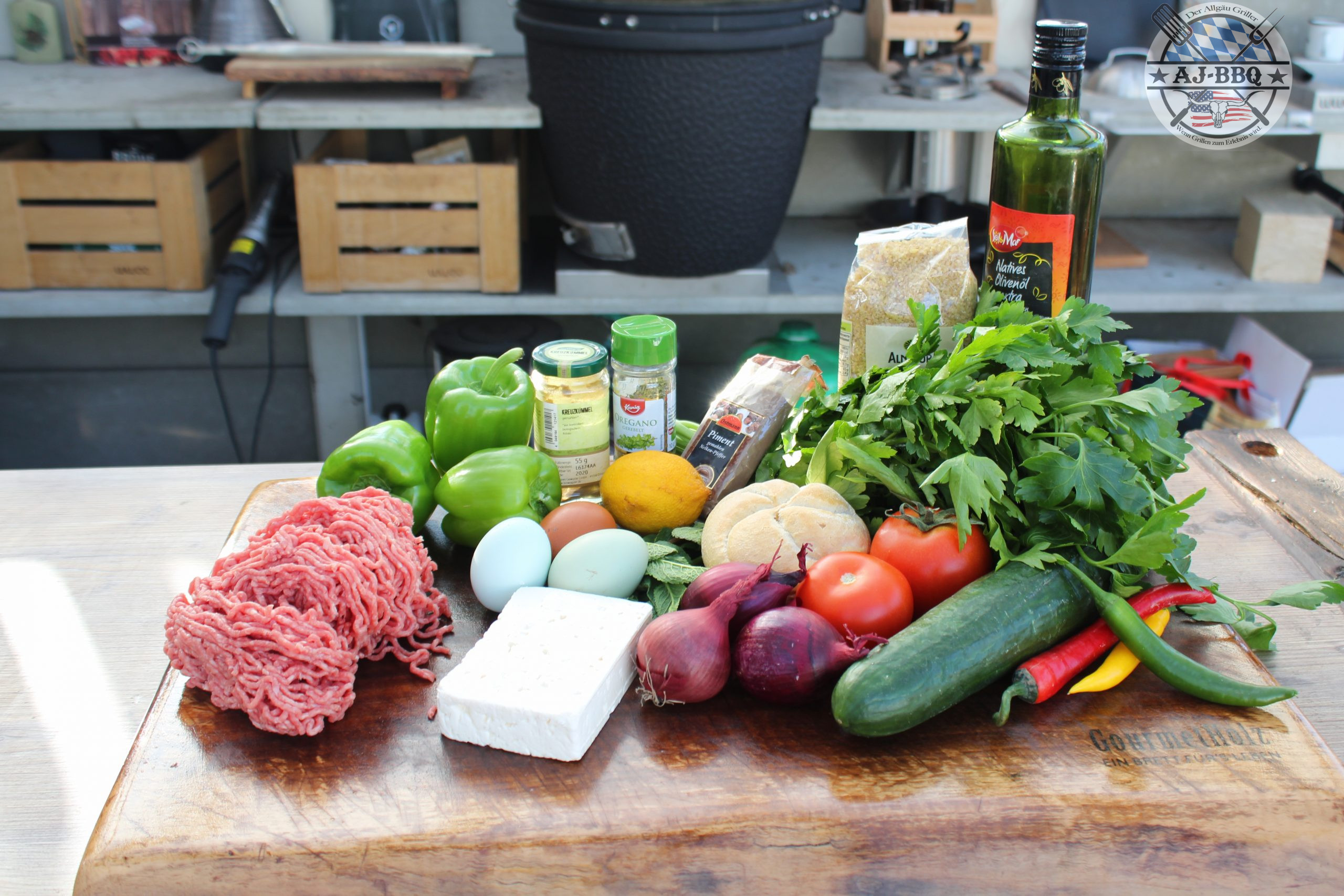 Zuerst stelle ich die Hachfleischmasse her. Hierfür weiche ich die altbackenen Semmeln in Wasser ein, drücke sie aus und rupfe die durchweichten Semmeln ganz klein in eine Schüssel. Dann kommt das Hackfleisch und die 4 Eier hinzu und dann wird schon mal alles gleichmäßig vermengt. Nun kommen die Hälfte der Petersilie, Piment, Kreuzkümmel, Salz und Pfeffer, Oregano und die Zwiebeln noch in die Hackmasse und schon ist diese fertig. Sollte sie zu feucht geraten, dass kann z.B. wegen zu feuchter Semmeln oder zu großer Eier passieren, kann sie mit Semmelbrösel noch verfestigt werden, bis sie eine perfekte, homogene Konsistenz hat.
