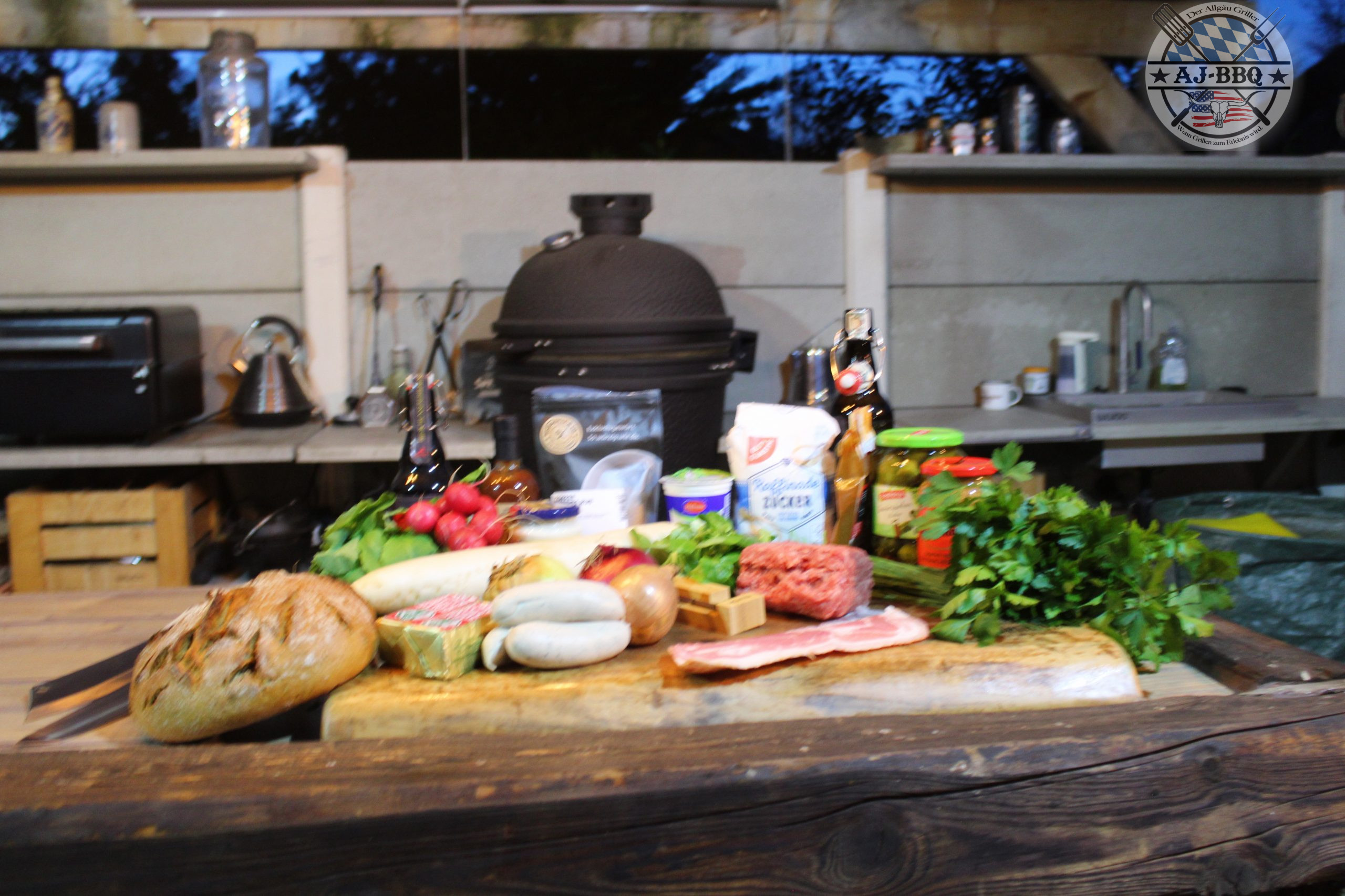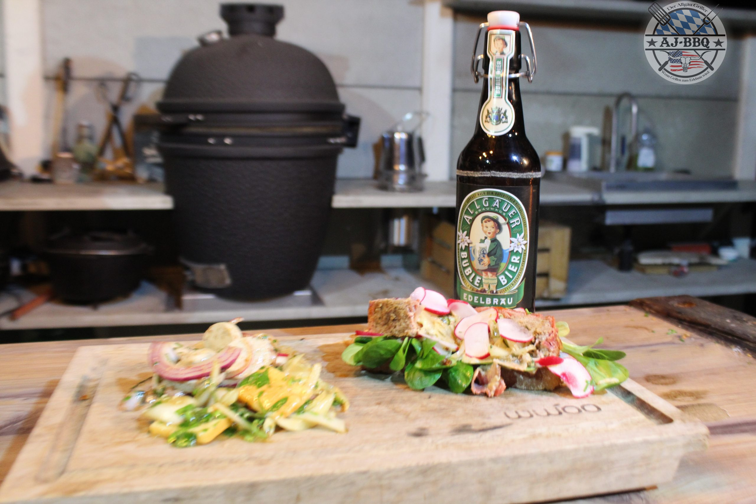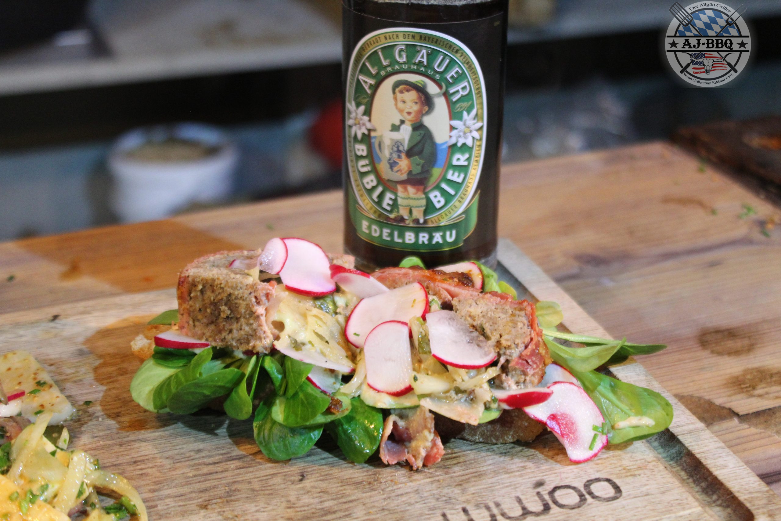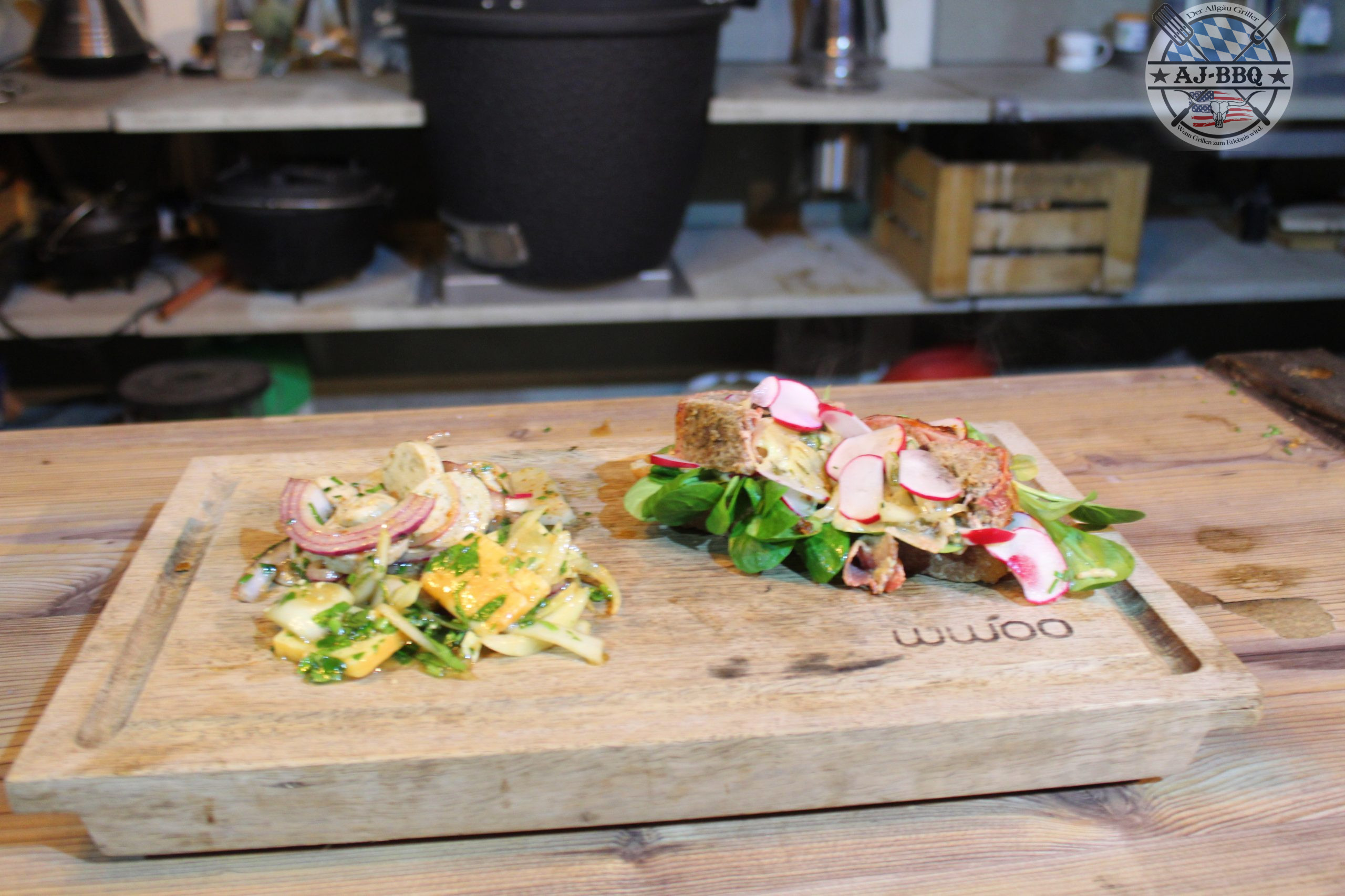 Liegt das Fleisch dann im Grill, kümmere ich mich noch um den Salat. Heute gibt es einen feinen Weißwurstsalat mit Rettich. Genau, richtig gehört! Weißwurstsalat! Mit Weißwürsten kann man soviel mehr leckeres Zeug machen, als nur ein Frühstück. Auch als Topping für Kartoffeln habe ich sie schon hergenommen. Neugierig? Dann schaut mal hier. Aber nun zum Salat. Hierfür halbiere ich den Rettich der Länge nach und schneide ihn ihn Scheiben. Die Weißwürste werden gepellt und ebenfalls in Scheiben geschnitten. Nun noch schnell die rote Zwiebel in halbe Ringe, die Essiggurken in Scheiben und den Schnittlauch in kleine Röllchen schneiden. Das alles vermische ich in einer Schüssel und beginne dann, die nächste Sauce zu erstellen. Dieses Mal aber eine Weißwurstsenf-Salatsauce. Hierfür mische ich Rapsöl und Bieressig in gleichen Teilen (etwa je 10 EL), 3-4 EL Weißwurstsenf, Salz und Pfeffer miteinander und vermenge abschließend alles mit dem Salat. Wer den Rettich etwas weicher haben möchte, nimmt das Salz nicht für die Salatsauce, sondern bestreut den Rettich vorher damit. Dadurch werden die Rettichscheiben schön weich. Ich mag Rettich sehr gerne mit knack und daher gebe ich das Salz hauptsächlich in die Sauce.