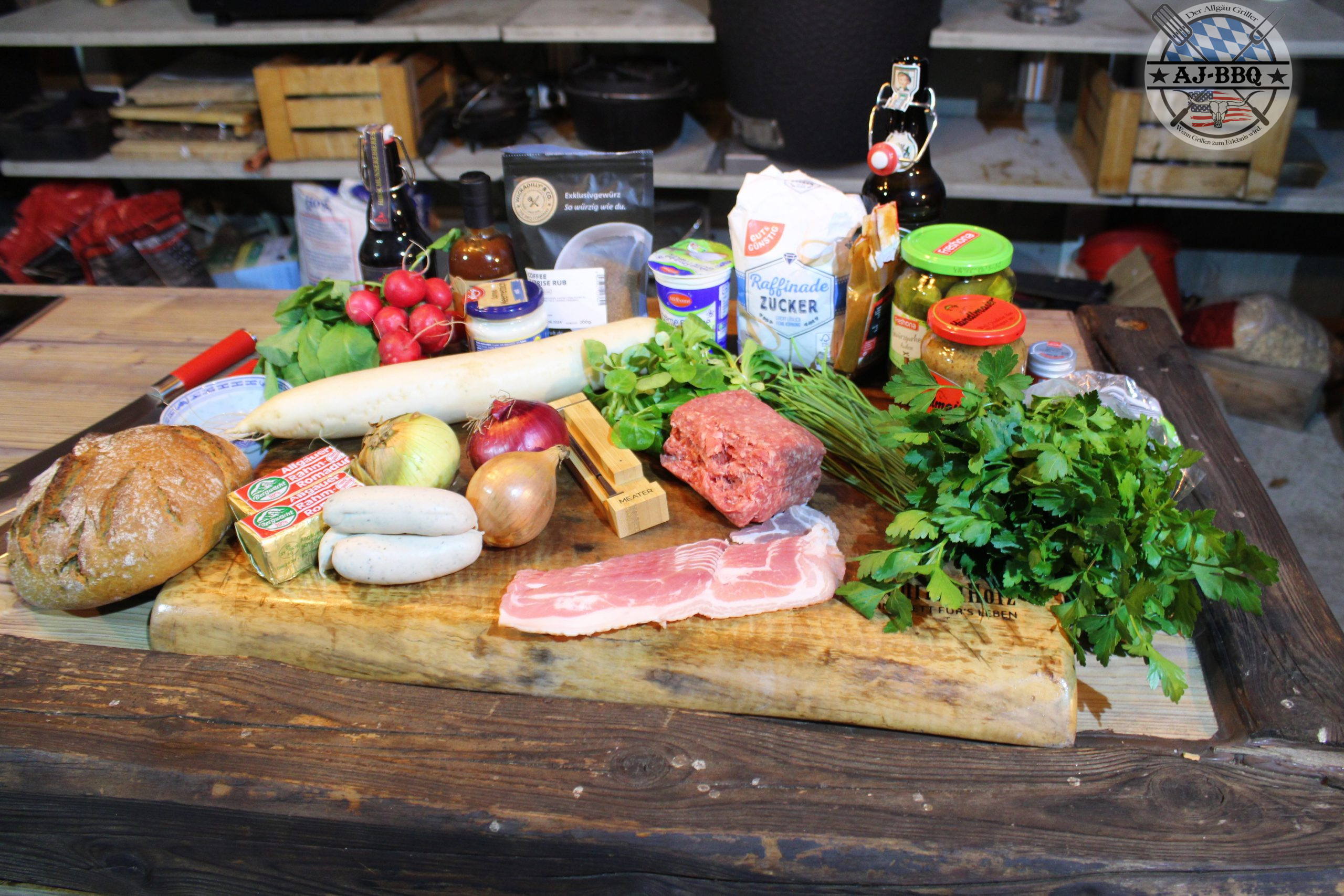 Zuerst wird der saure Käs‘ gemacht, damit der noch etwas ziehen und somit unglaublich feinen Geschmack entwickeln kann. Dafür schneide ich zwei Zwiebeln in längliche Streifen, hacke die Petersielie und schneide den Romadur in Scheiben. Alles zusammen gebe ich in eine Schüssel und mische dann die Salatsauce an. Hierfür mische ich 75 ml Wasser, 7 EL Öl, ca. 100 ml Bieressig (alternativ kann man gerne auch Weißweinessig verwenden), einen EL Zucker, Salz, Pfeffer, Kümmel und Cayennepfeffer in einem Behältnis miteinander und schütte dann alles über den Käse. Jetzt alles nur noch schnell miteinander vermengen und schon ist der saure Käse fertig und kann schön durchziehen.