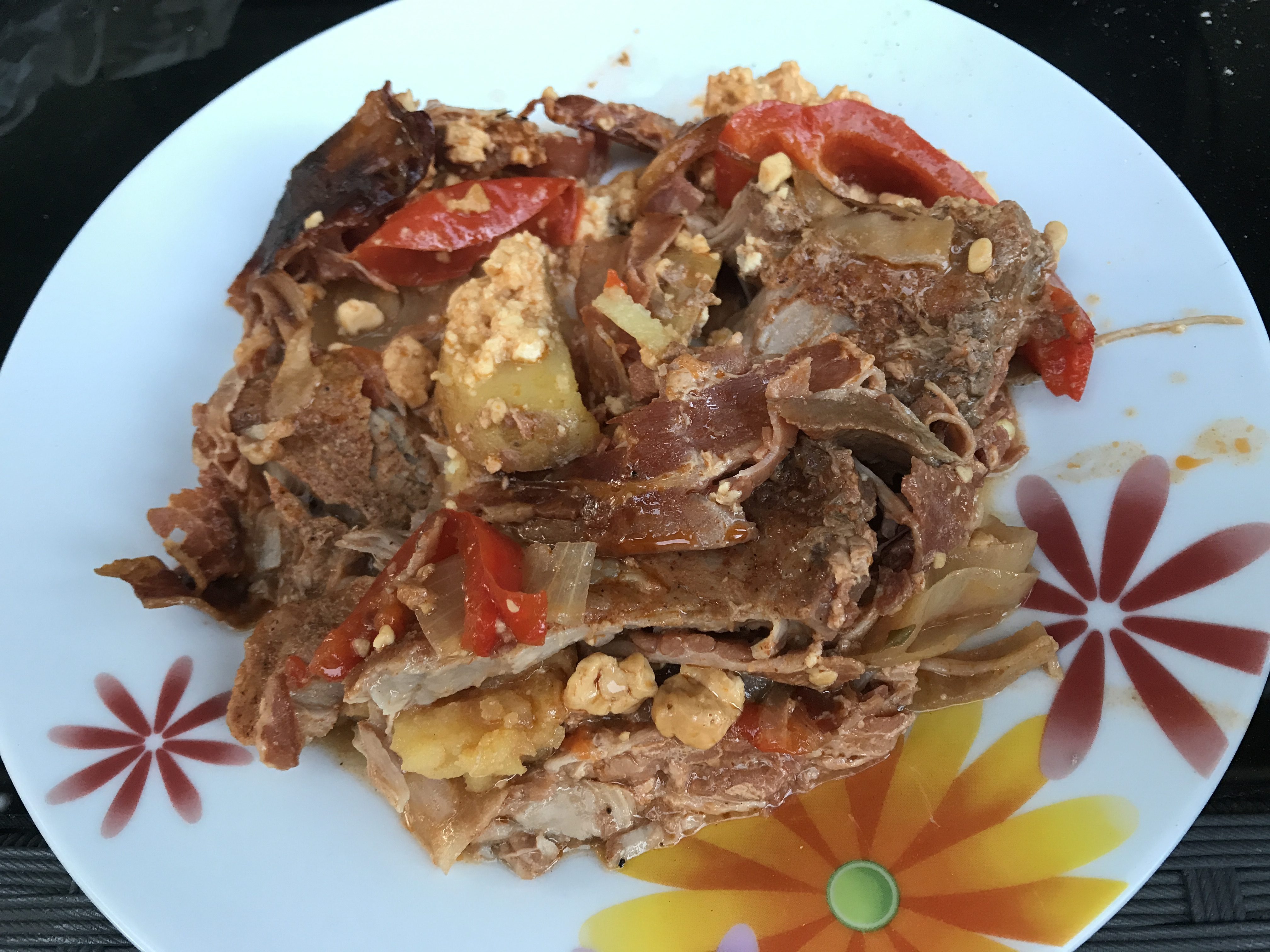 3. Nun geht es an das Füllen. Man sollt immer mit einer Scheibe Fleisch anfangen und auch aufhören. Also schichtet man erst Fleisch, dann Kartoffeln, Zwiebeln, Paprika und dann wieder von Vorne, bis der Dutch Oven voll ist. Evtl. übergebliebenes Gemüse stecke ich in jede Spalte, die ich entdecken kann.