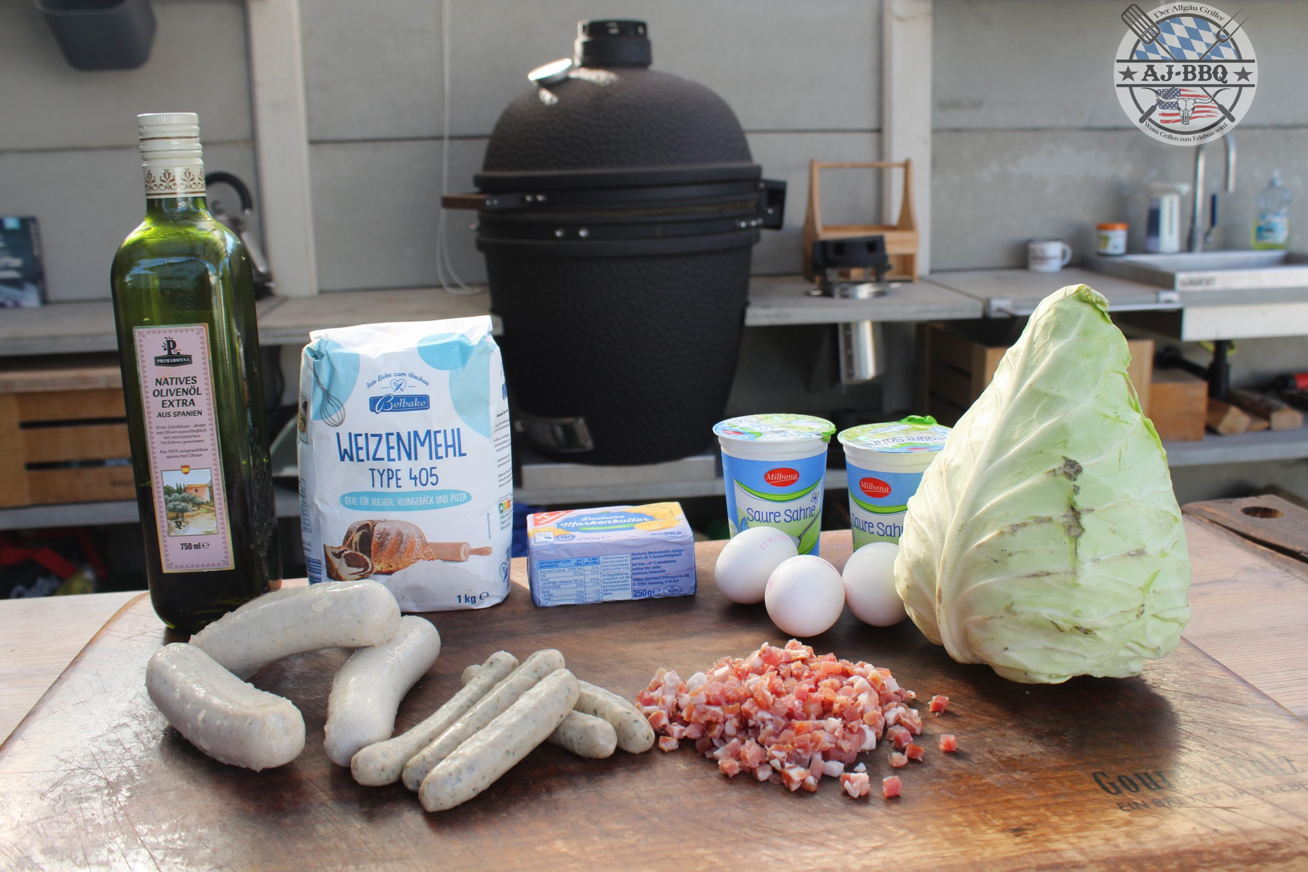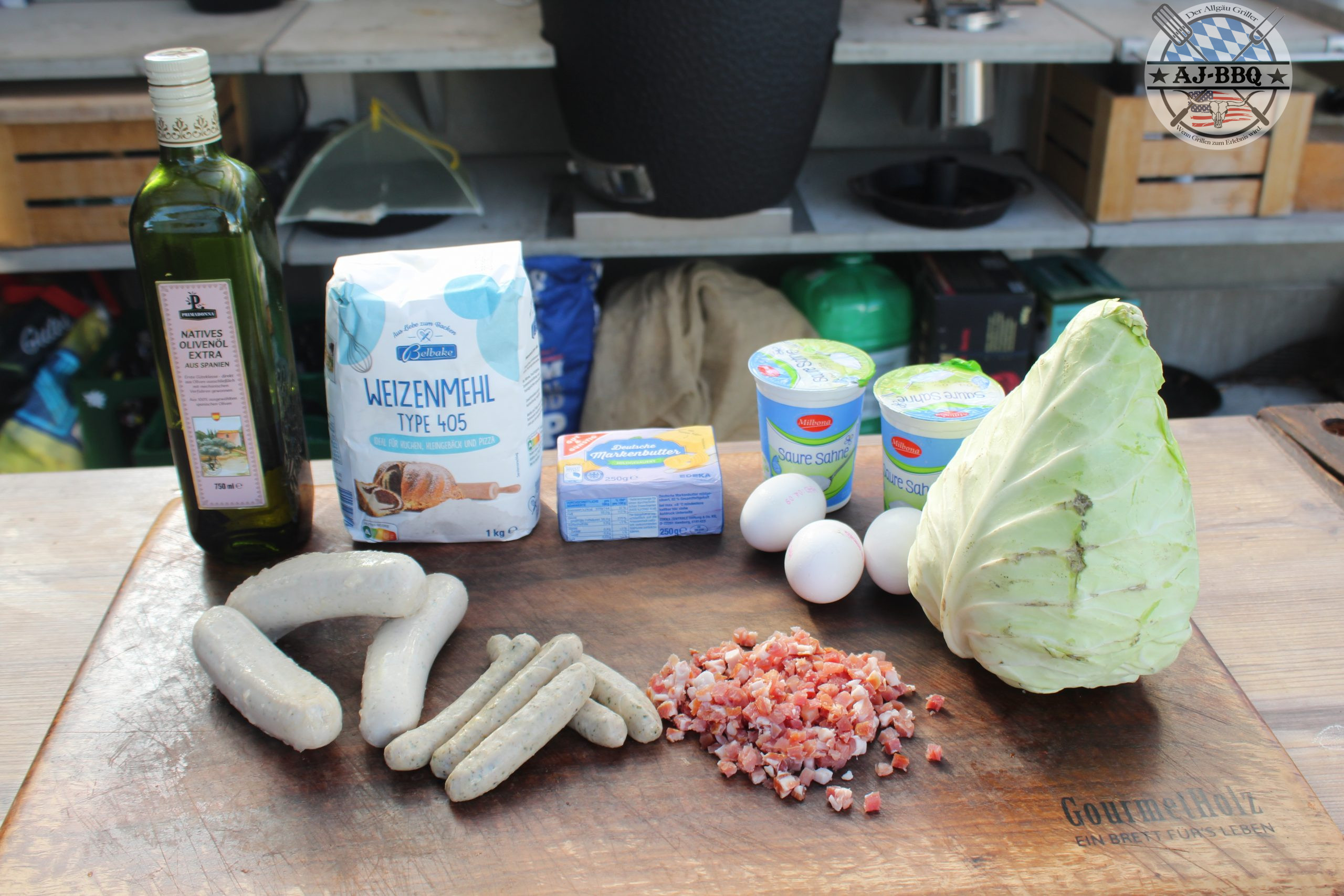 - Diese Mischung vermenge ich nun mit dem erkalteten Kraut und fülle alles in den vorbereiteten Kuchenteig. Jetzt klappe ich die Ränder des Teiges etwas um und gebe die Pfanne bei den vorgeheizten 200°C für etwa 45 Minuten indirekt in den Grill. Sind diese vorbei verteile ich um die Pfanne im Grill nur noch schnell die Bratwürste und grille diese so schön fertig, bis sie eine feine karamellisierte Haut haben und innen schön saftig sind. Hier ist es natürlich überaus hilfreich, wenn man dementsprechend viel Grillfläche hat. Ist das nicht der Fall, kommt ihr nicht umher, einen weiteren Grill für die Würste zu starten.