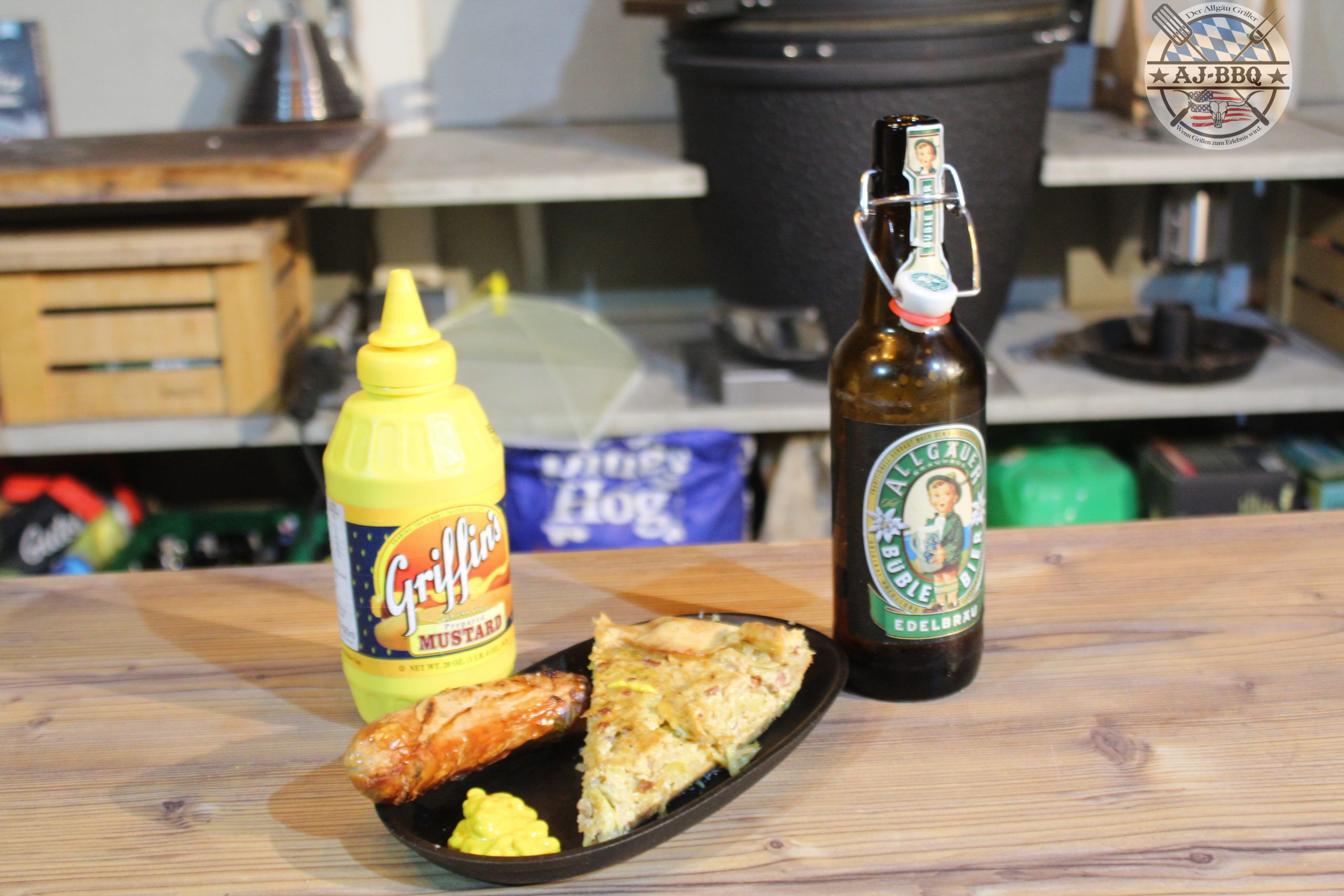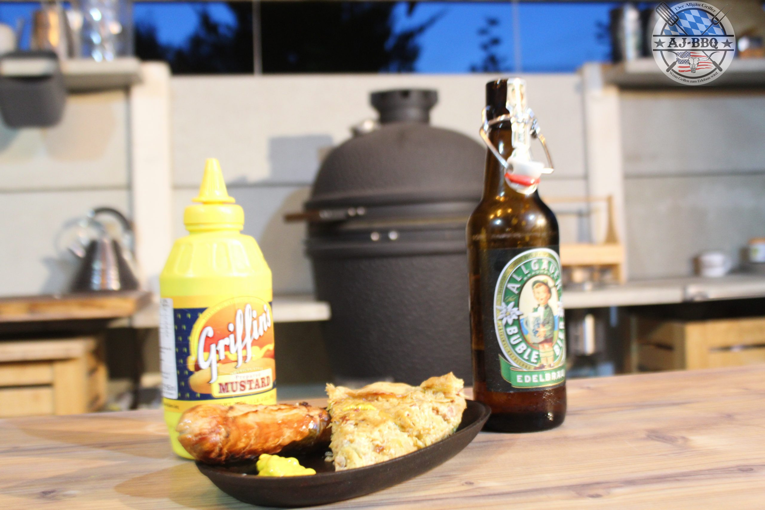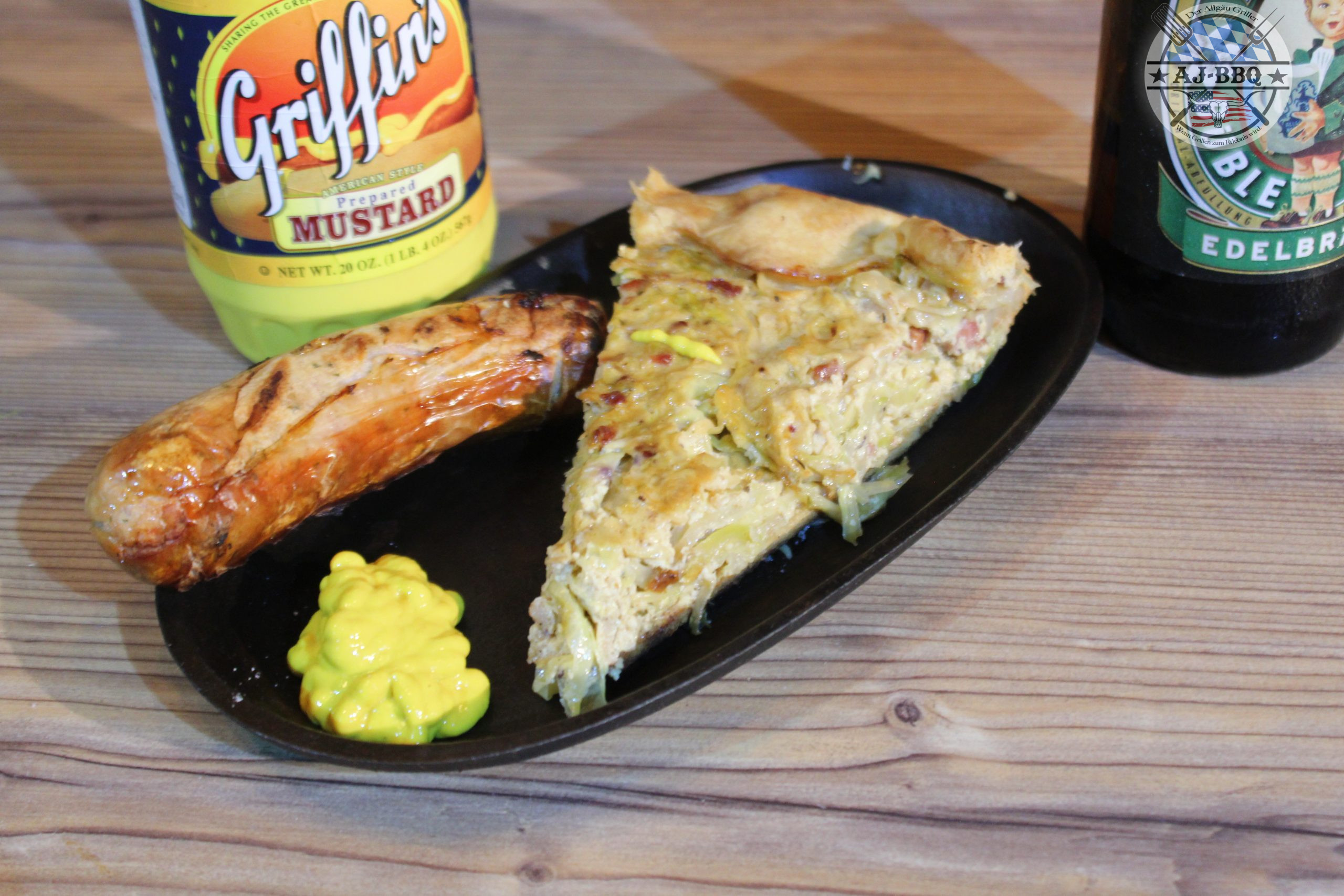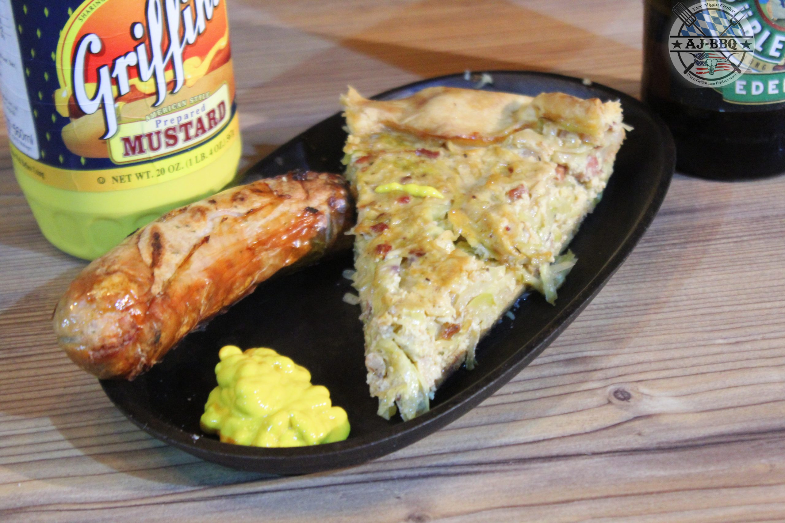 Diese Mischung vermenge ich nun mit dem erkalteten Kraut und fülle alles in den vorbereiteten Kuchenteig. Jetzt klappe ich die Ränder des Teiges etwas um und gebe die Pfanne bei den vorgeheizten 200°C für etwa 45 Minuten indirekt in den Grill. Sind diese vorbei verteile ich um die Pfanne im Grill nur noch schnell die Bratwürste und grille diese so schön fertig, bis sie eine feine karamellisierte Haut haben und innen schön saftig sind. Hier ist es natürlich überaus hilfreich, wenn man dementsprechend viel Grillfläche hat. Ist das nicht der Fall, kommt ihr nicht umher, einen weiteren Grill für die Würste zu starten.