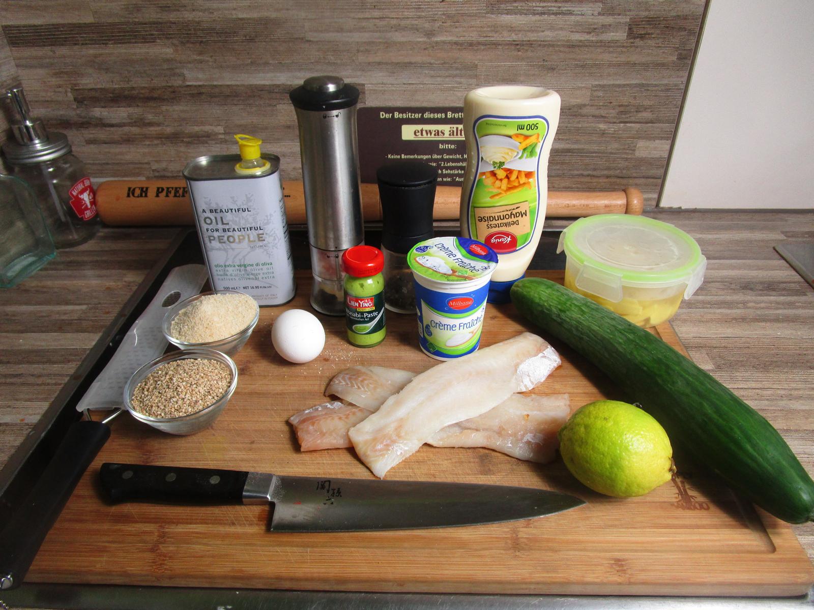 - Als nächstes hacke ich den Sushi-Ingwer klein, gebe ihn mit dem Abrieb der Limette, den Semmelbröseln, dem Ei, Salz und Pfeffer in die Schüssel zu dem Fisch und vermische alles gründlich. Aus dieser Masse werde ich nun 4 ungefähr gleichgroße Pattys formen. Diese Fischpatties „paniere“ ich nun noch in den Sesamsamen und schon sind sie fertig.