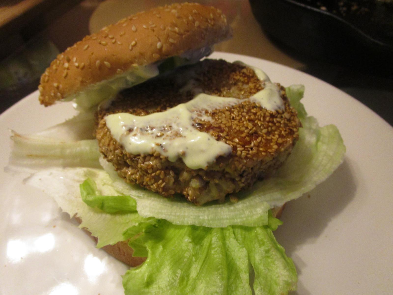 - Auf den Boden des Burgerbrötchens gebe ich erst einmal das Salatblatt, dann den Fischpatty, als nächstes eine gute Schicht der Wasabimayo und zu guter letzt noch etwa drei Gurkenscheiben und den Burgerdeckel.