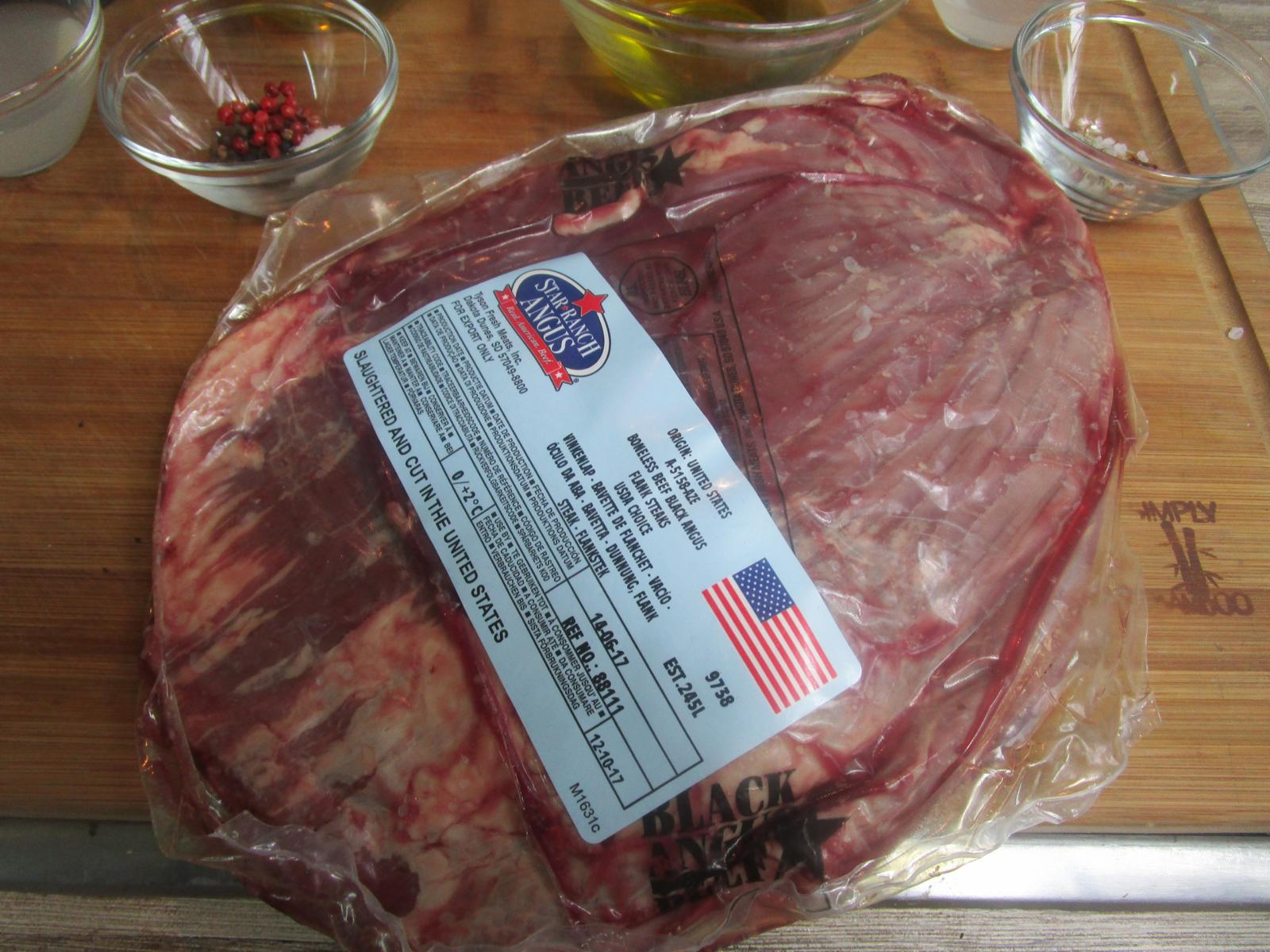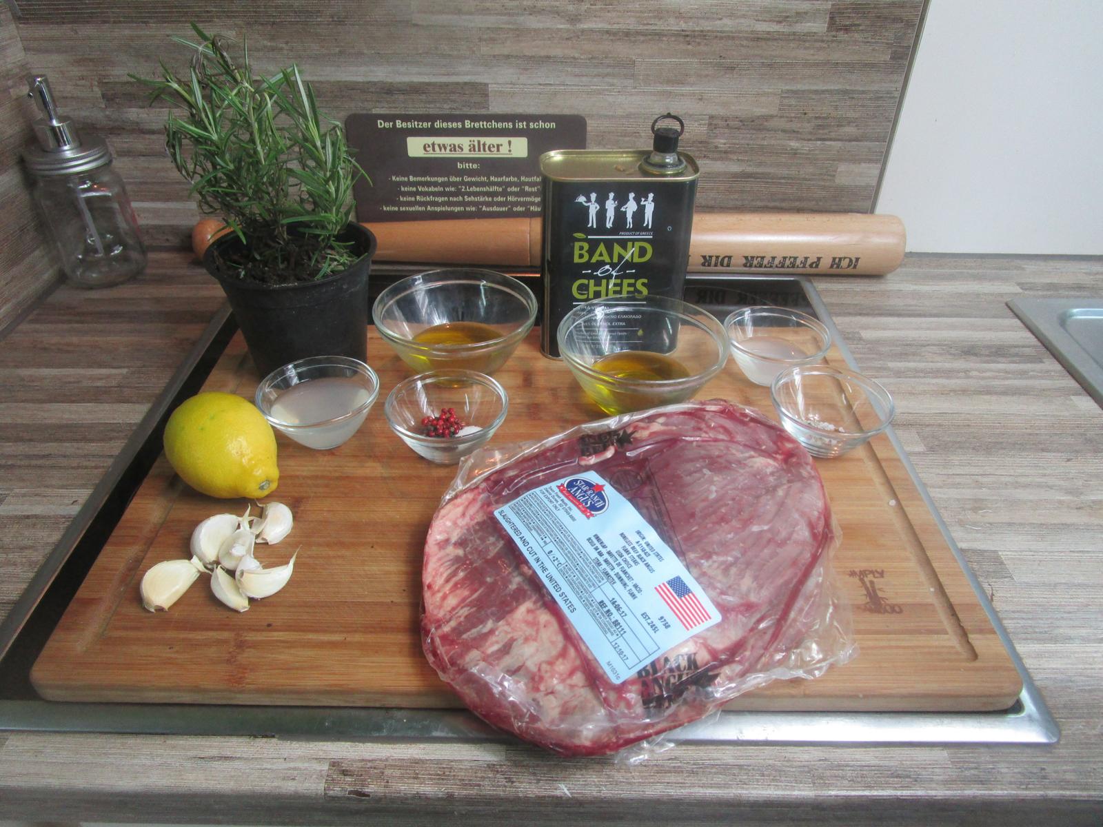 - Dann pariere ich das Flanksteak, d.h. alles überschüssige Fett und Sehnen werden entfernt. Außerdem schneide ich das Steak auf einer Seite rautenförmig ein, damit die Marinade besser einziehen kann und das Steak sich auf dem Grill nicht verformt.