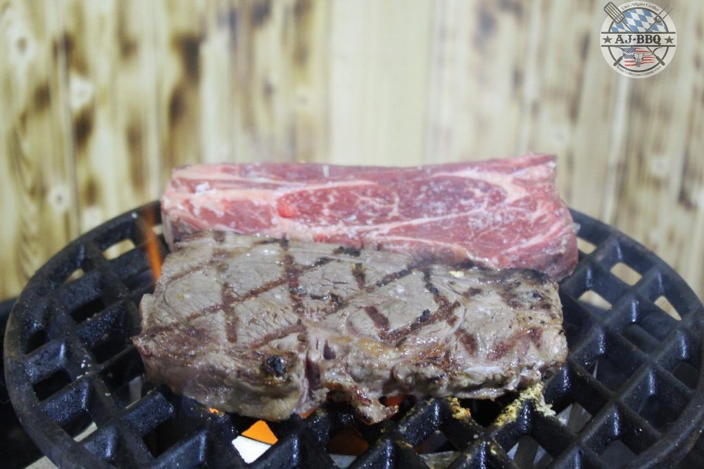 Wir widmen uns wieder dem Fleisch, das unser Andy mit Salz und Pfeffer würzt. Sobald ihr damit fertig seid, nehmt ihr die Pfanne vom Grill und legt den Rehrücken in den direkten Bereich auf. 2 Minuten links, 2 Minuten rechts und unser Schmankerl sollte durch sein. (Hierbei sollten wir natürlich auch eine Kerntemperatur erreichen. Im Fall des Rehrückens sollte diese bei ca. 58°C liegen.)