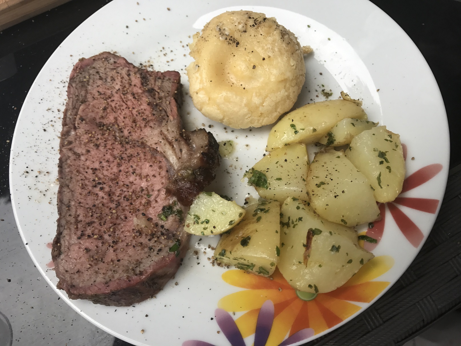 - Bei einer Kerntemperatur von insgesamt 56°C ist das Fleisch fertig und kann serviert werden. Ich habe dazu noch Steakpfeffer gereicht.