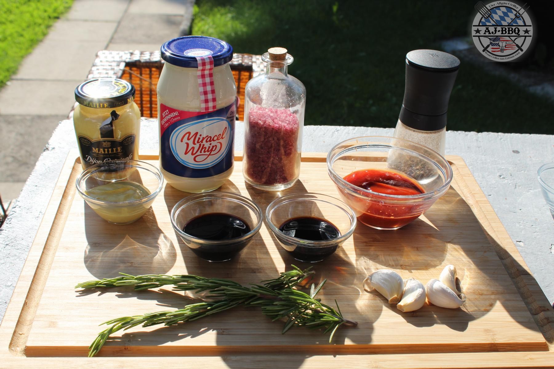 - Für diesen phantastischen Burger benötigen wir überhaupt nicht viel Zeit. Zuerst werde ich das Hackfleisch würzen. Dafür hacke ich mir etwa 2 TL Rosmarinnadeln und den Knoblauch ganz fein und gebe alles mit 3 EL Balsamico, 2 TL Salz und Pfeffer nach Geschmack mit dem Hackfleisch zusammen in eine Schüssel.