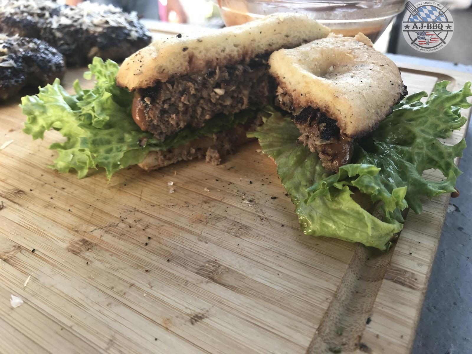 - Sind die Pattys fertig gegrillt, können wir den Burger schon zusammenbauen. Dafür nehme ich zuerst einmal alles vom Grill. Dann bestreiche ich beide Seiten des Burgerbrötchens mit der Sauce, lege ein paar Salatblätter auf die Unterseite und darauf dann endlich unser Hackfleischpatty. Jetzt noch schnell den Deckel auflegen und fertig ist der Toskanaburger aus dem Buch Weber’s Burger.