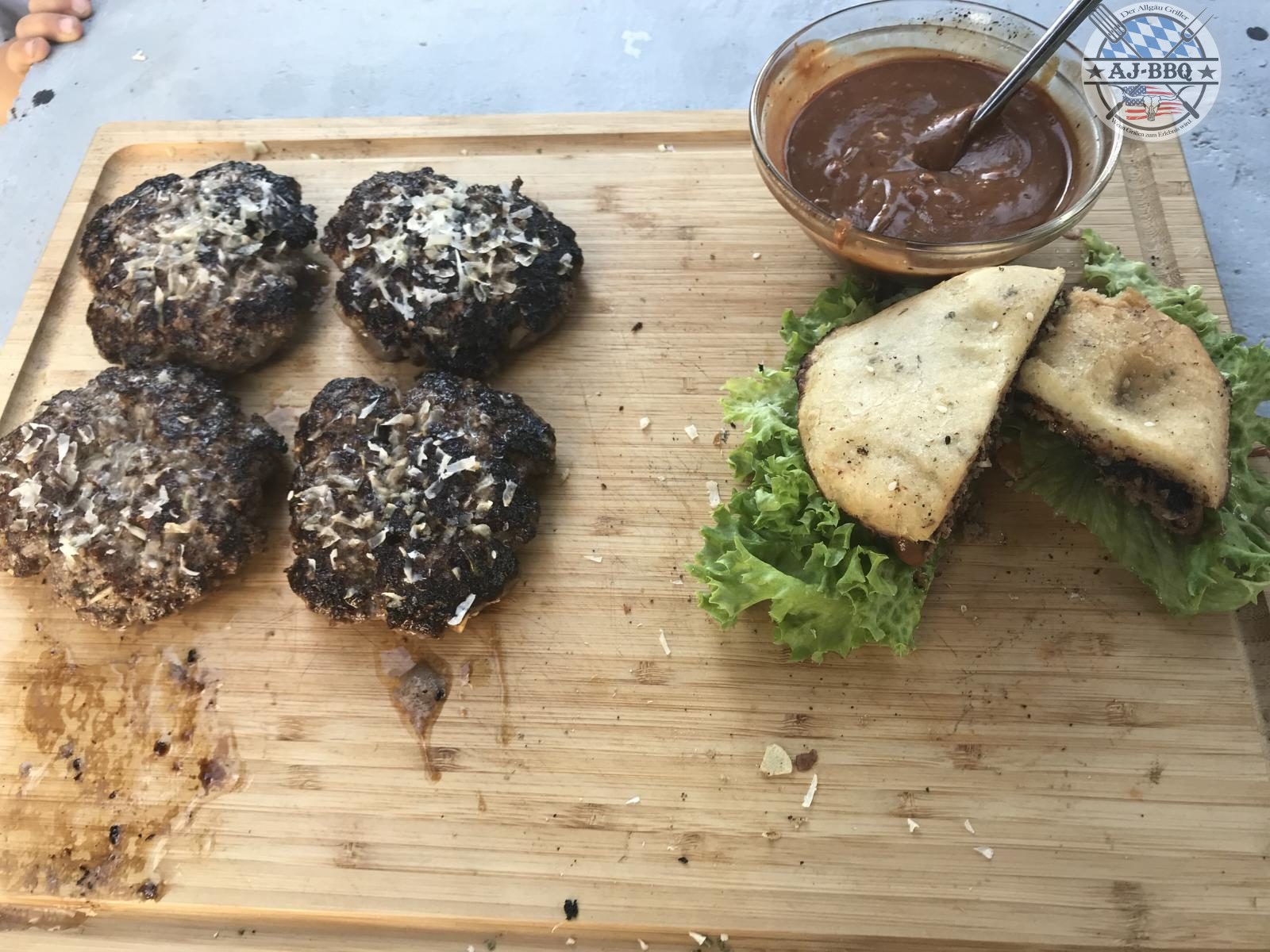 - Kurz vor Ende der Grillzeit lege ich noch die aufgeschnittenen Burgerbrötchen auf den Grill/die Grillplatte und röste die Innenseiten leicht an. Außerdem reibe ich noch den frischen Parmesan mit einer Microreibe auf die Pattys und lasse diesen darauf schmelzen.