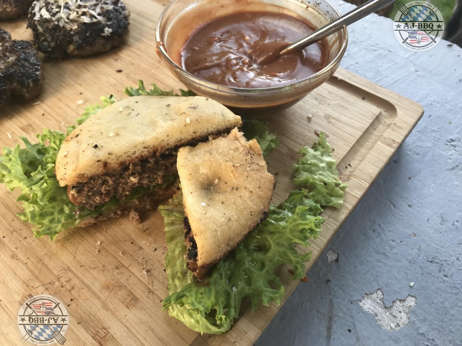 - Jetzt wird endlich gegrillt! Im Grill werden die Pattys jetzt über der direkten Hitze beidseitig scharf angeröstet und dann in der indirekten Zone fertig gegrillt. Auf der Feuerplatte verhält sich das übrigens genau so. Dort lege ich die Pattys direkt in die Mitte. Dort ist es am heißesten. Sind sie beidseitig angebraten, ziehe ich sie nach außen in eine kühlere Zone und brate sie dort fertig. Wenn ihr mit einem Kerntemperaturfühler arbeit, würde ich die Pattys auf etwa 60°C ziehen. Vorausgesetzt, dass Hackfleisch war frisch.