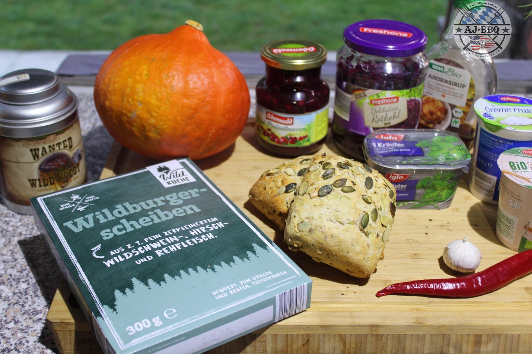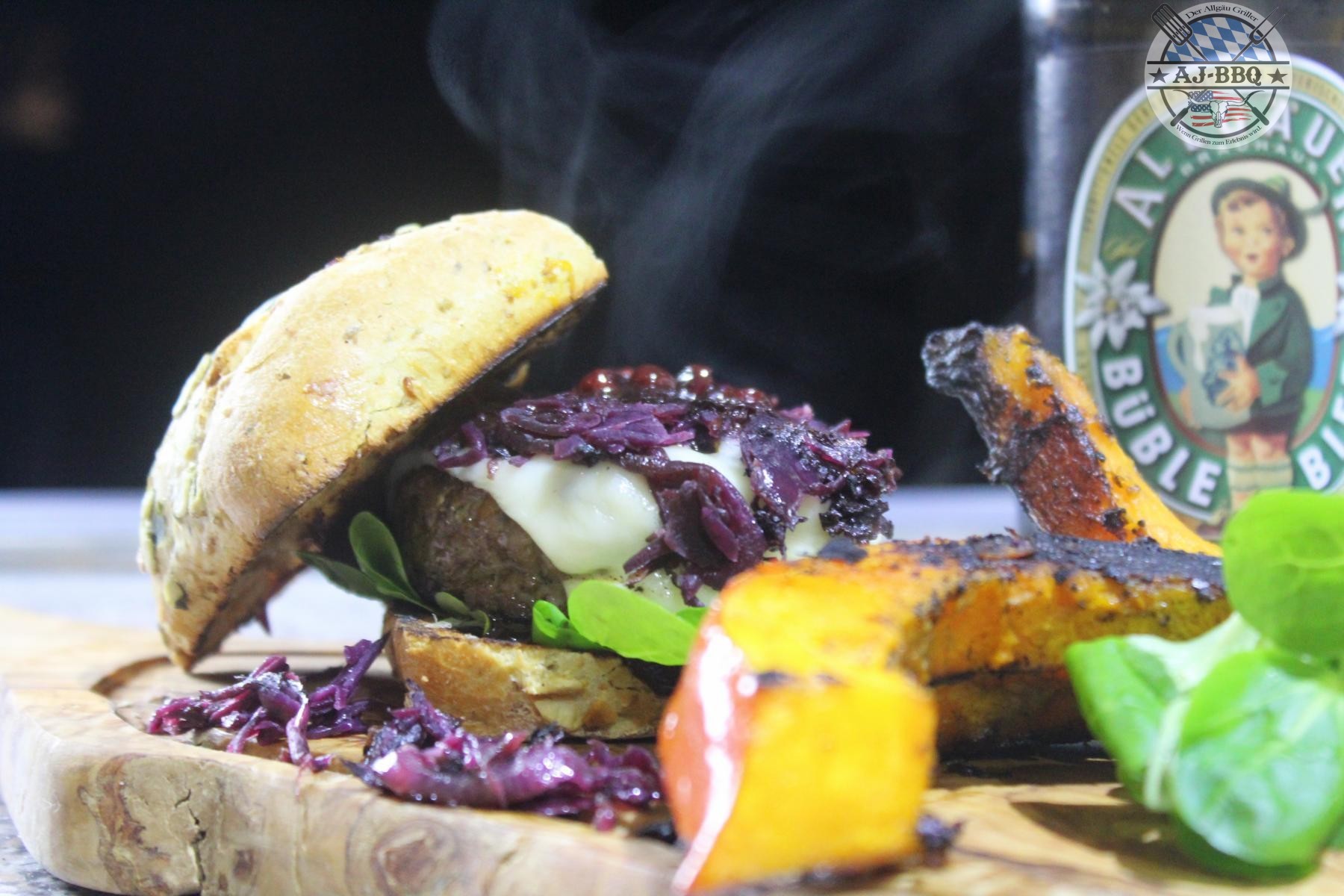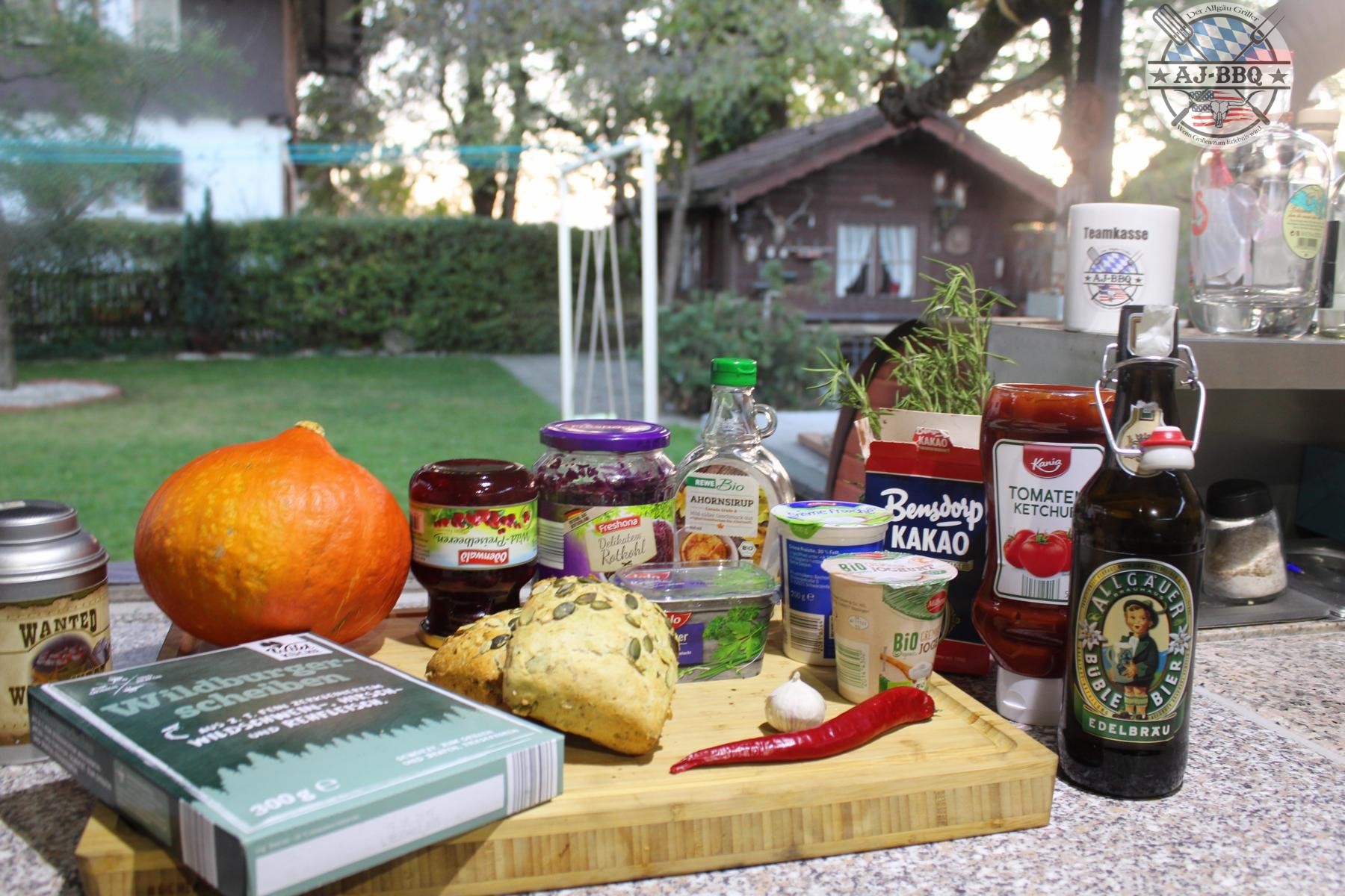 - Jetzt geht es endlich ans grillen. Im Video verwende ich dafür meine Feuerplatte. Habt ihr so etwas nicht zur Verfügung, nehmt einfach euren Kugelgrill, Gasgrill, oder auch nur eure Pfanne dafür her. Der Grill sollte dabei für hohe direkte und indirekte Hitze vorbereitet werden. Die noch gefrorenen Pattys werden nun zuerst scharf und direkt angegrillt und dann in der indirekten Zone gargezogen. Außerdem sollte man jetzt noch die Preiselbeer-Schoko-Sauce in den Grill stellen, damit diese warm wird. Natürlich nur in einer feuerfesten Schüssel. Während die Pattys garziehen und mit einer Scheibe Käse überbacken, grillt man noch die Kürbisspalten über direkter Hitze bis sie weich sind, dünstet auf der Feuerplatte oder in einer Pfanne das Blaukraut und die Zwiebeln miteinander an und röstet die aufgeschnittenen Semmeln leicht an.