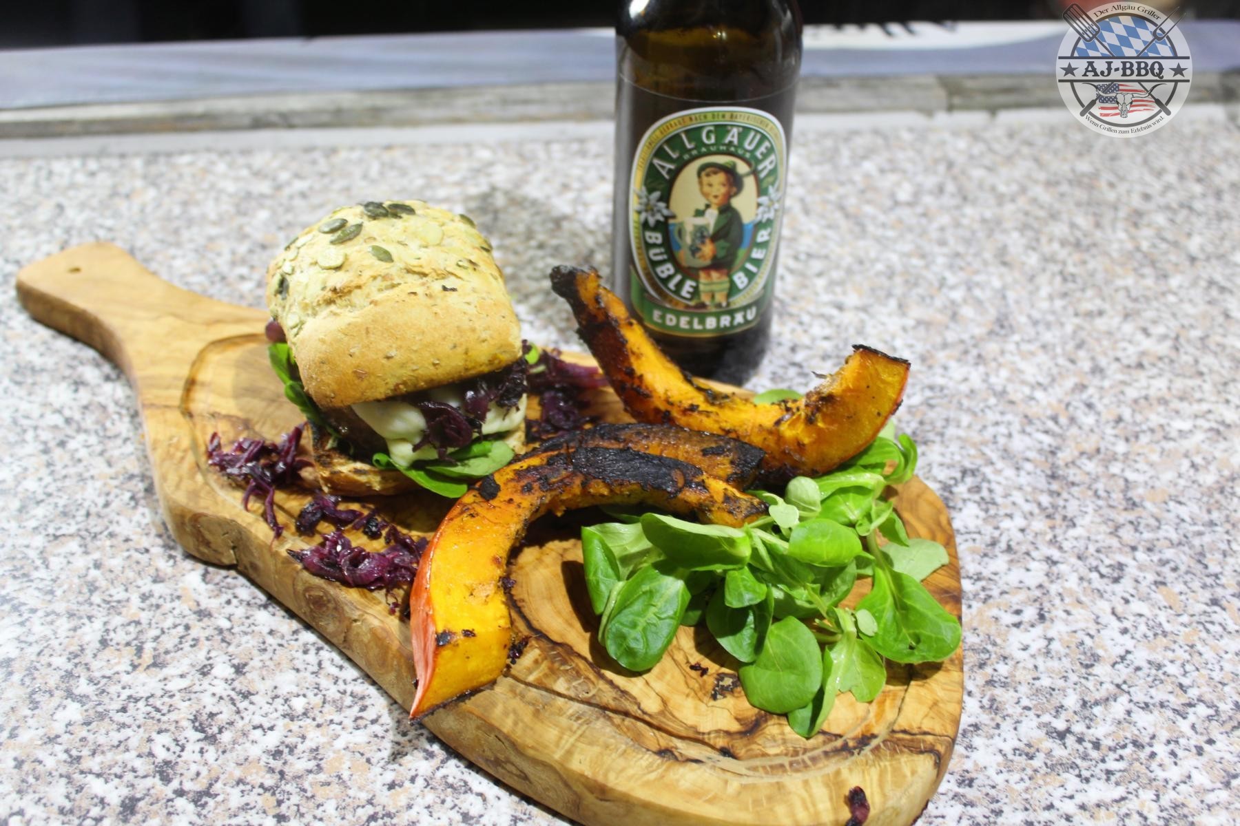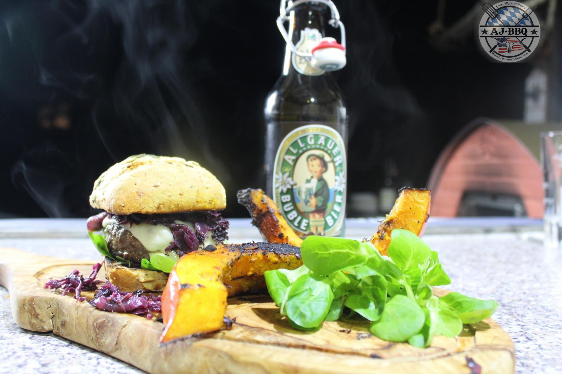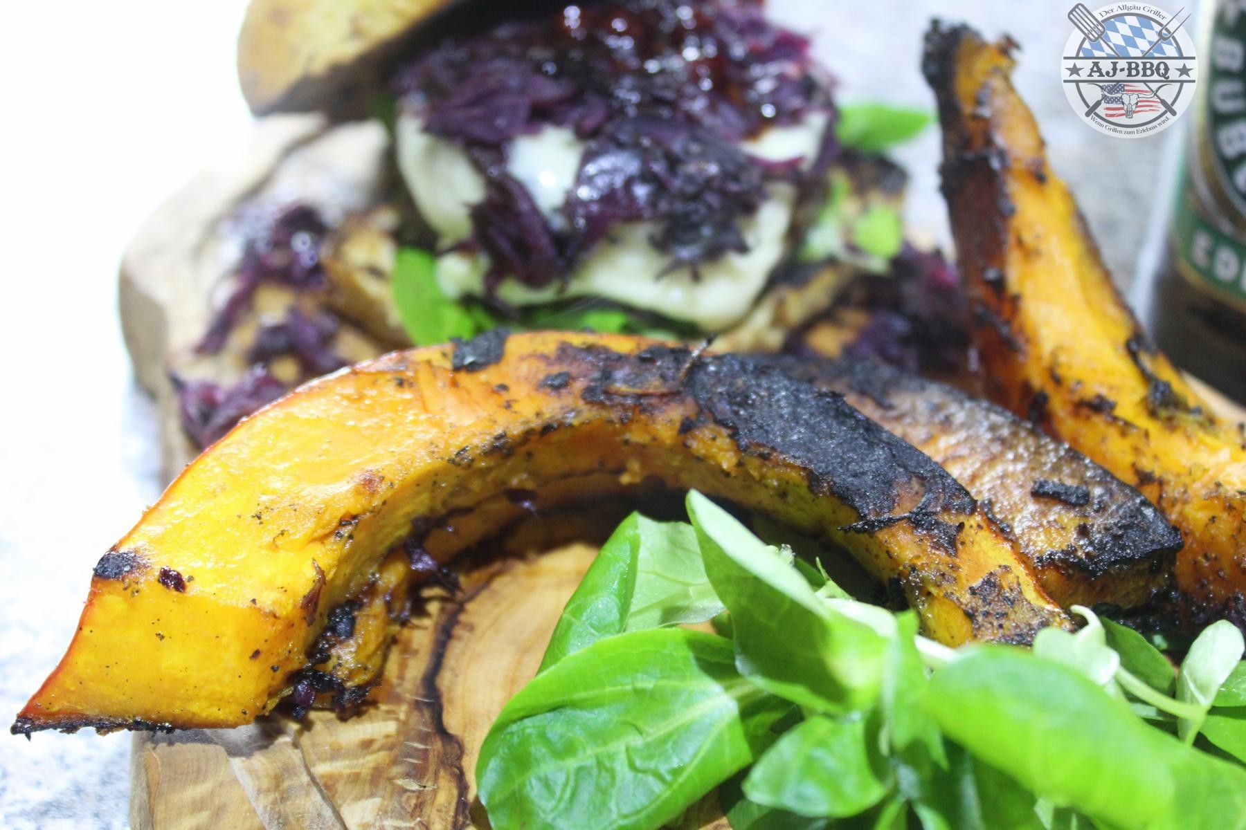 - Schon nach kurzer Zeit kann dann der Burger zusammengesetzt werden. Dafür streiche ich etwas Sauce auf die Unterseite des Semmels, verteile darauf etwas Feldsalat, lege dann das Patty mit dem geschmolzenen Käse, das Blaukraut und zum Schluss den Deckel des Brötchens darauf. Serviert wird mit den Kürbisspalten und dem Dip.