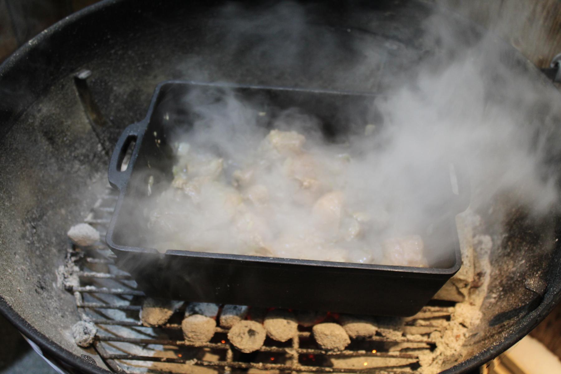 - Als nächstes gehe ich nach draußen und bereite alles für den Dutch Oven vor. Meinen Anzündkamin habe ich zu etwa 3/4 gefüllt und glühe diesen nun durch.